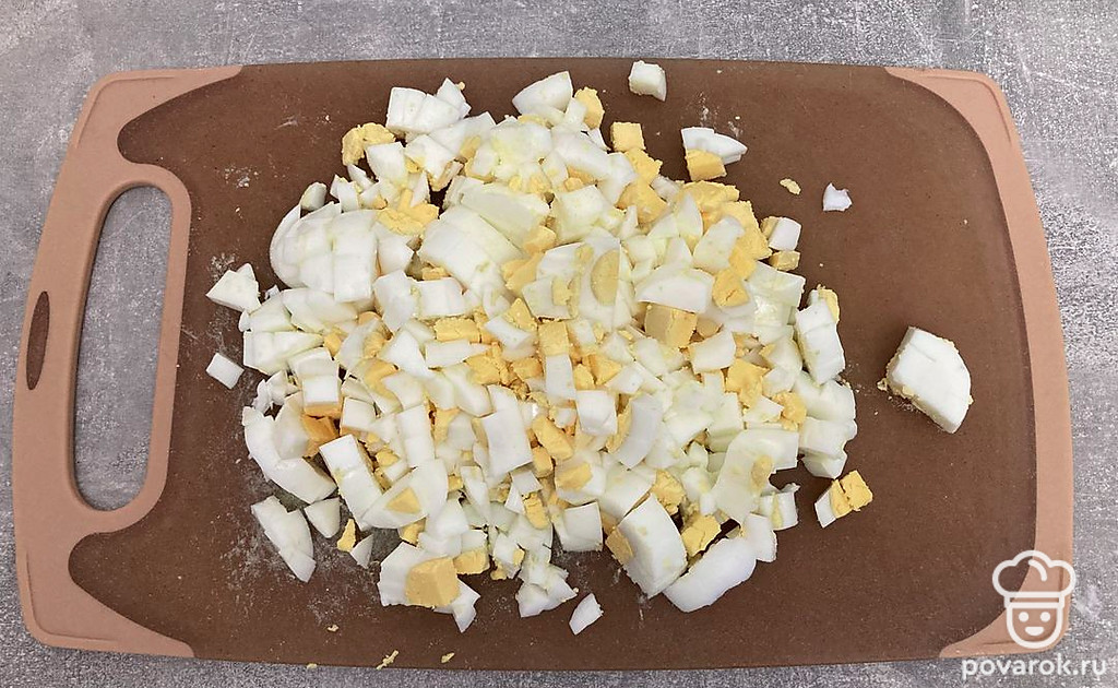Нарежьте яйца на кубики одинакового размера.