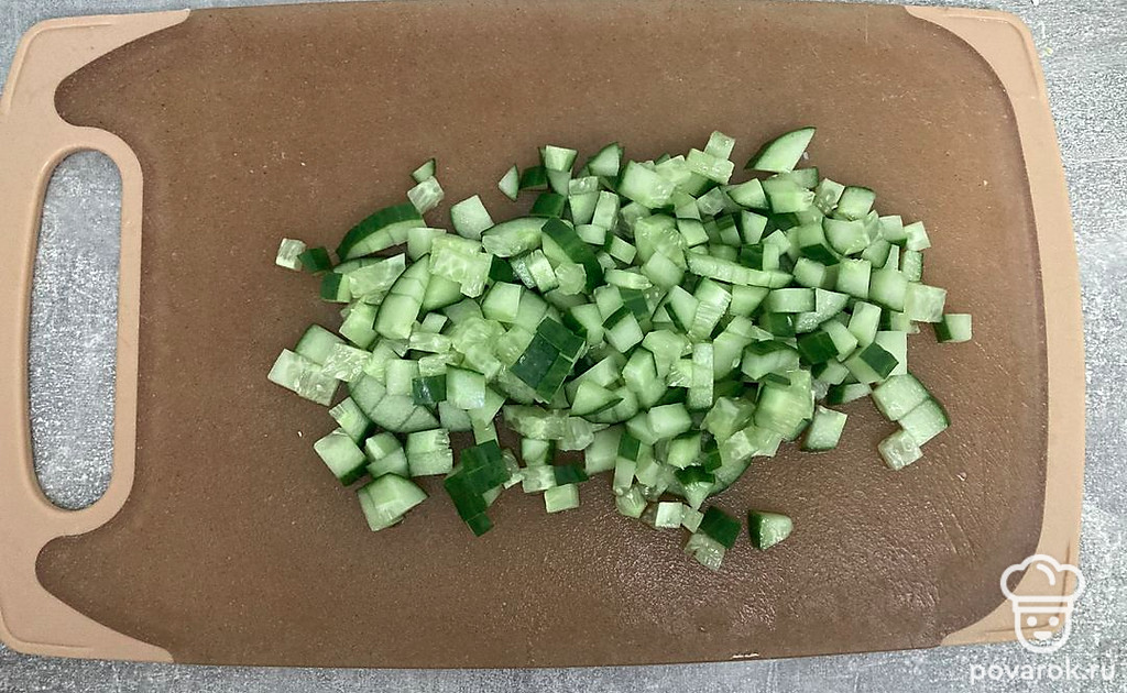 Огурец нарежьте. У меня один большой огурец. Если маленькие огурцы, их понадобится больше.