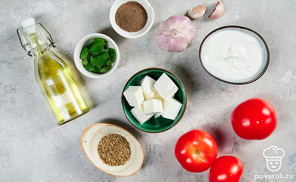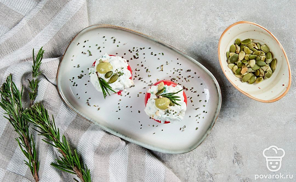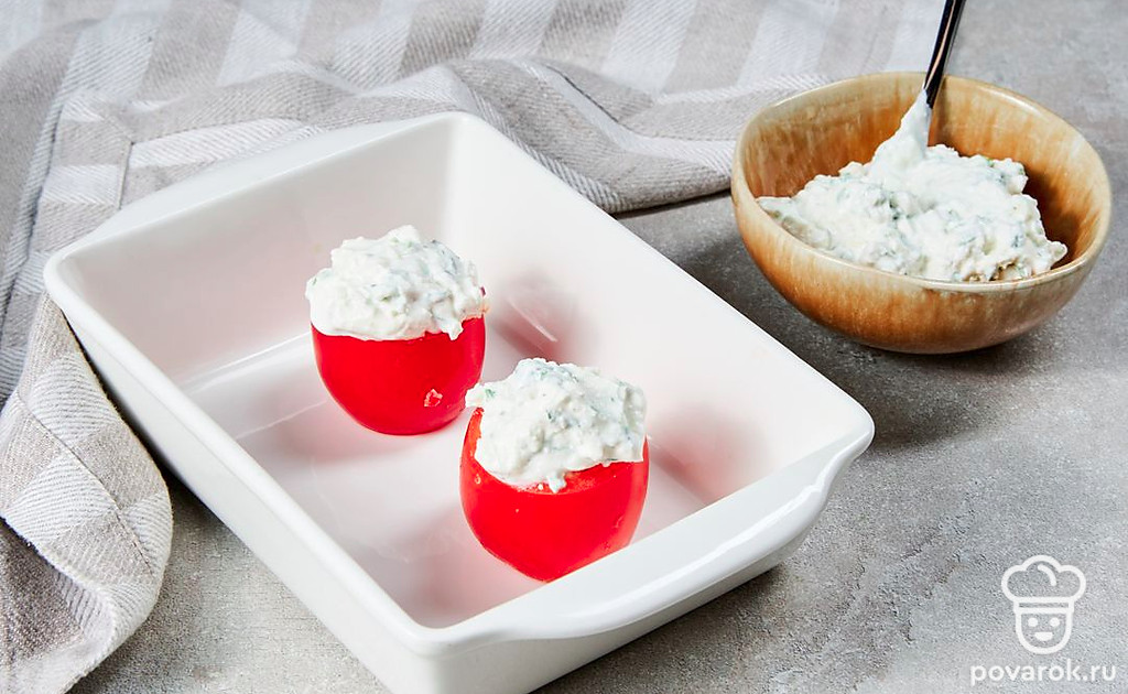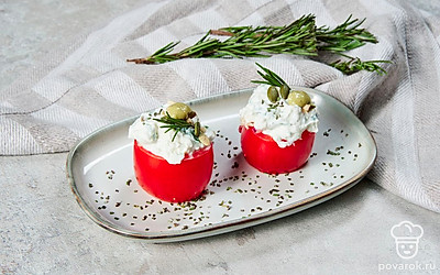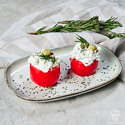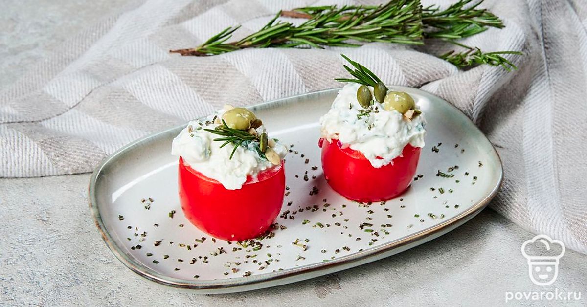 Фаршированные помидоры — блюдо, которое можно подать как в качестве закуски, так и на гарнир. В рецепте помидоры наполняют начинкой из сыра фета. Это полезный продукт с пикантным вкусом и легкой кислинкой. Кисломолочные бактерии, содержащиеся в сыре, нормализуют работу пищеварения. Помидоры с начинкой лучше запекать в верхней части духовки. Готовность можно определить по треснувшей кожице.