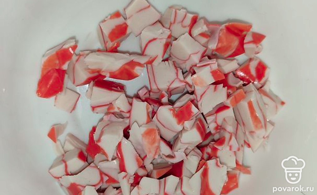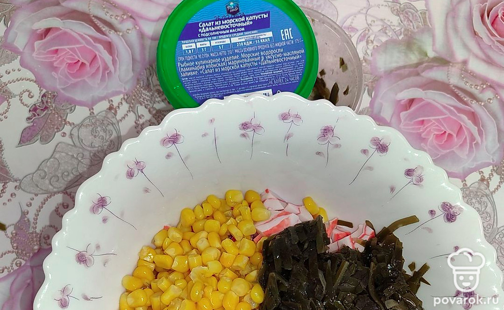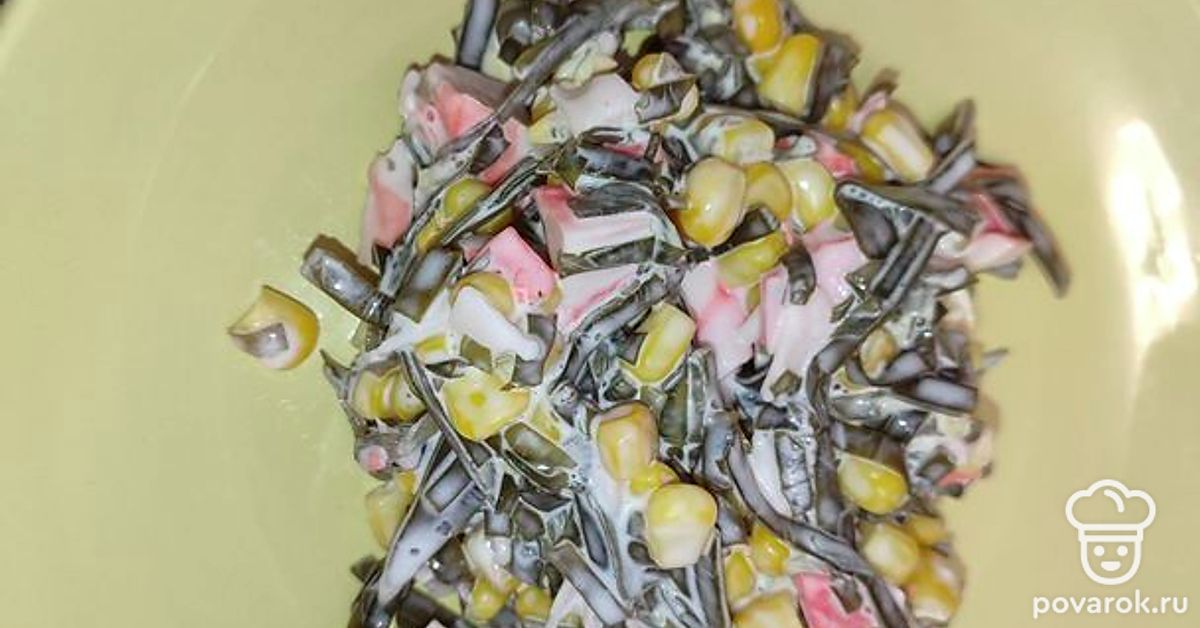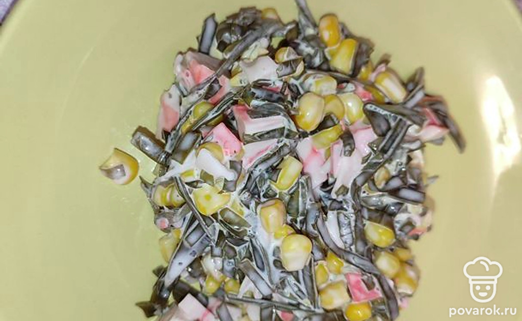 В салатник добавте кукурузу и капусту, предварительно слейте лишнюю жидкость. Заправьте майонезом, перемешайте. Салат готов.