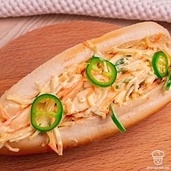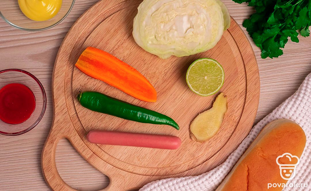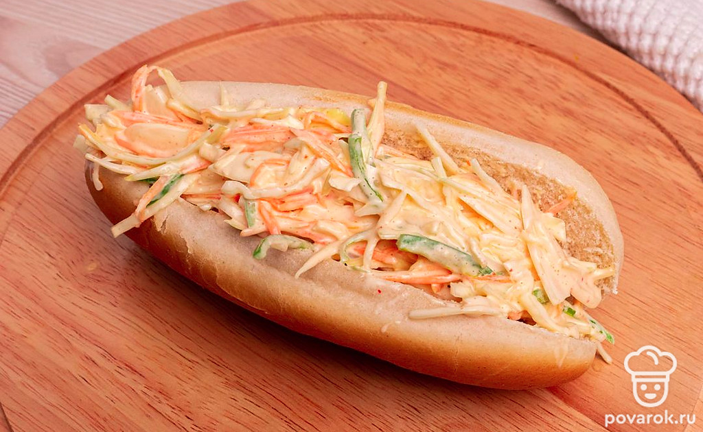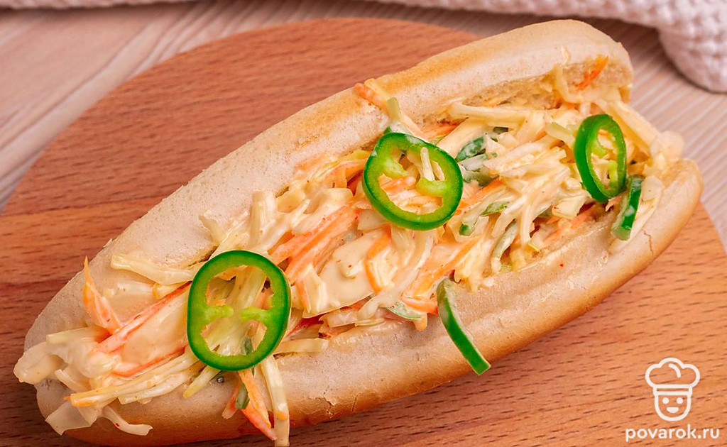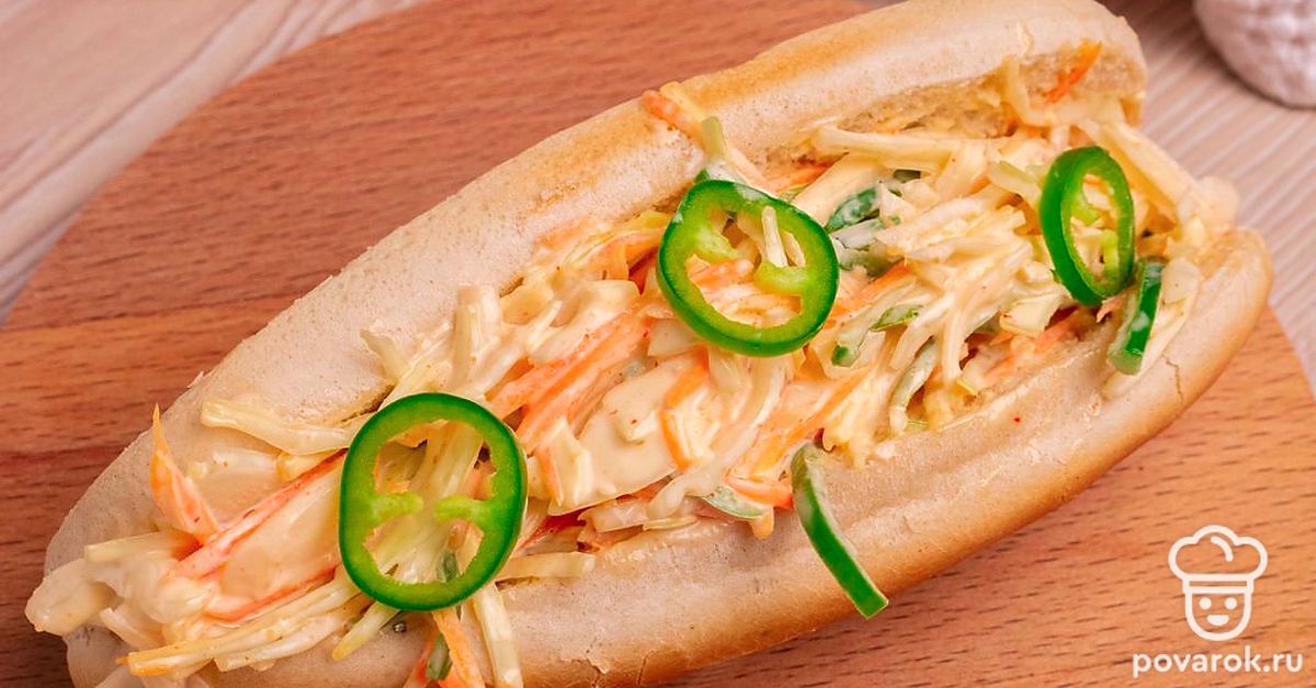Существует простой способ сделать фаст-фуд полезнее! Необходимо добавить в начинку немного салата из пряной капусты! В приготовлении хот-дога используются удлиненные булочки. В центр кладут сосиску и соус. В этом рецепте, кроме сосиски, в начинку американского хот-дога добавляется пряный салат из белокочанной капусты с морковью, соленым огурцом и острым перцем! Добавьте кетчуп и горчичный соус в качестве заправки для салата. Хот-дог станет еще вкуснее!