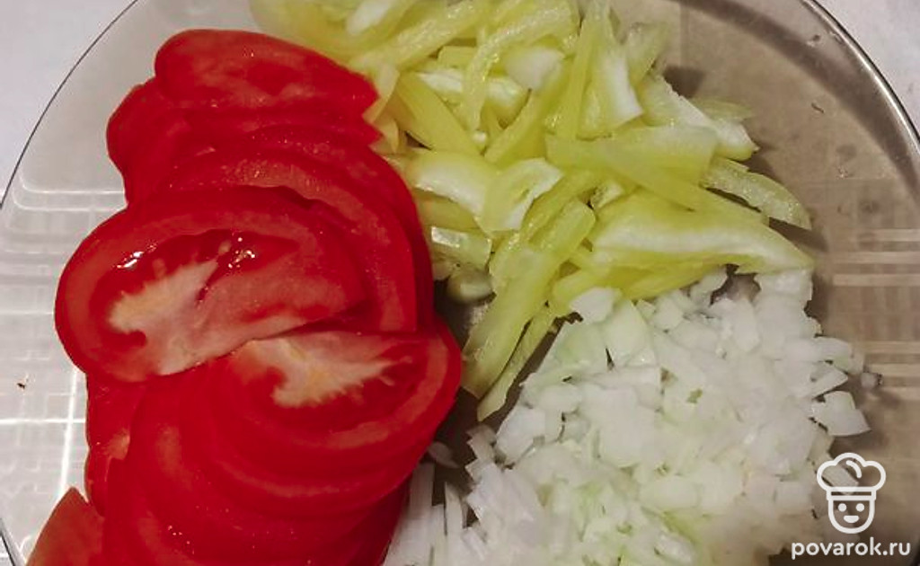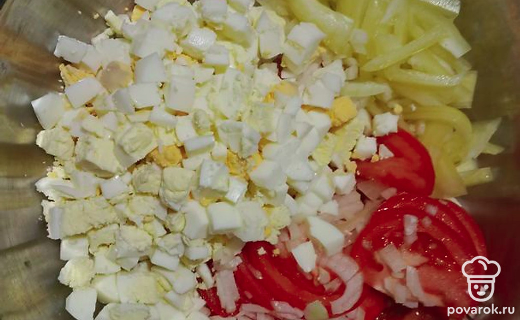 Варим яйца. Режем помидор дольками. Перец нарезаем полосками, а лук — мелким кубиком.