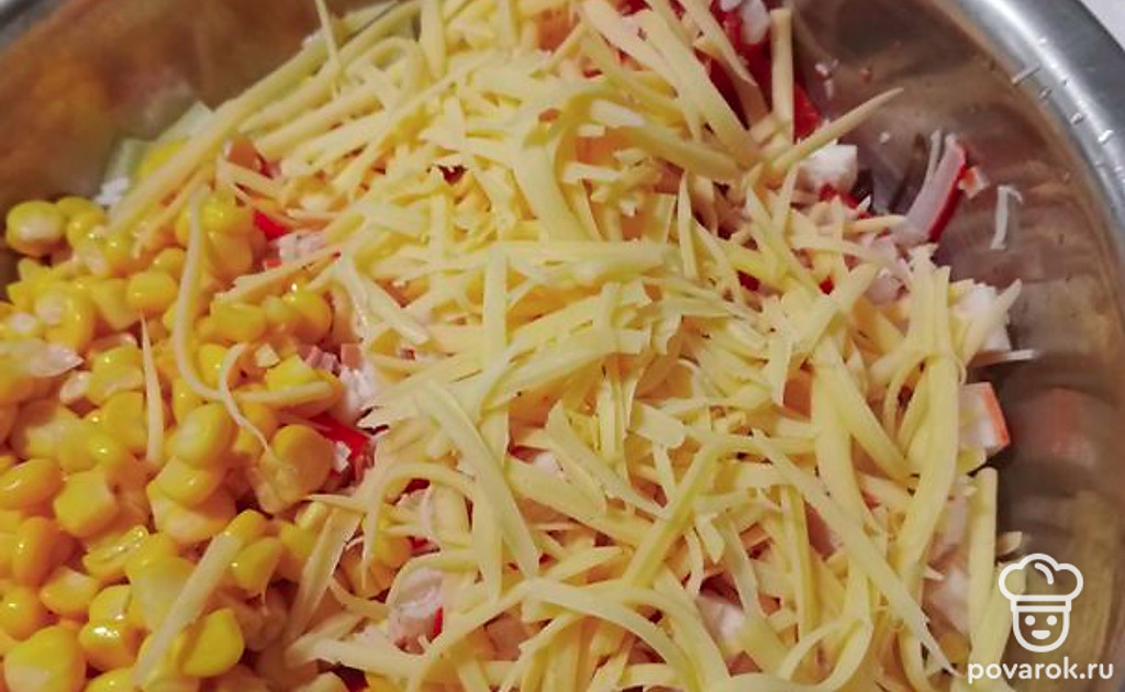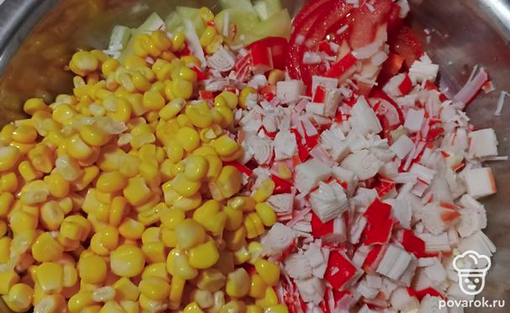 Кубиками нарезаем крабовые палочки, сливаем воду из кукурузы и высыпаем все в миску.