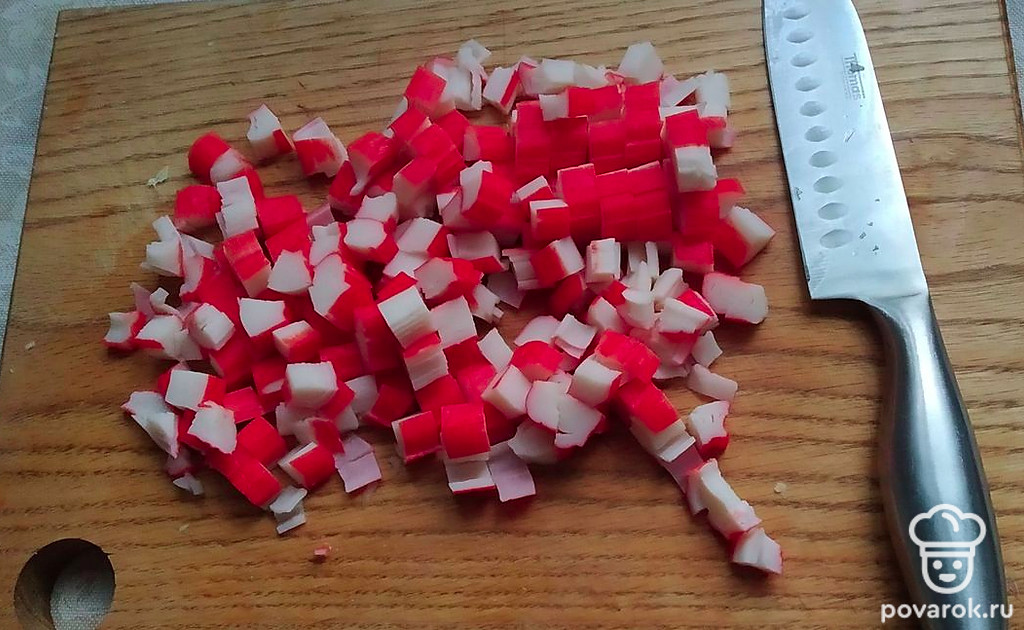 Нарезать крабовые палочки.