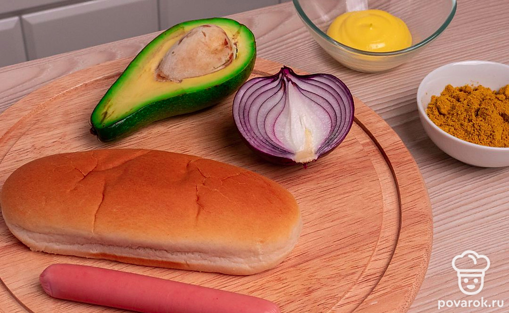 Американский перекус в виде хот-дога стал популярен во всем мире еще в прошлом веке. В его приготовлении используются удлиненные булочки. В центр кладут сосиску и соус. В этом рецепте, кроме сосиски, в начинку американского хот-дога добавляются мелконарезанные авокадо и репчатый лук! Такое дополнение явно сделает блюдо более полезным! Сделайте жидкую основу из горчичного соуса с добавлением специи карри. Хот-дог станет еще аппетитнее и вкуснее!