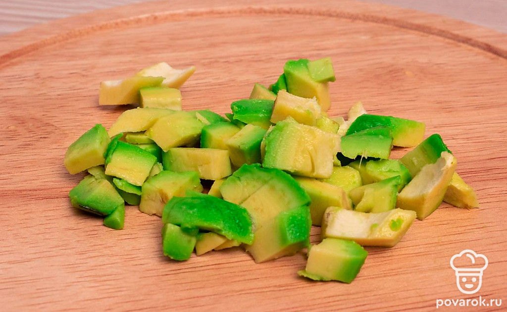 На разделочной доске нарежьте кубиками среднего размера очищенное авокадо и репчатый лук.