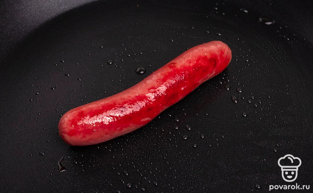 На сковороде, смазанной растительным маслом, обжарьте сосиску до появления румянца. Затем снимите ее со сковороды.