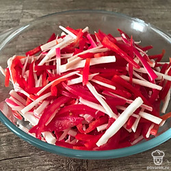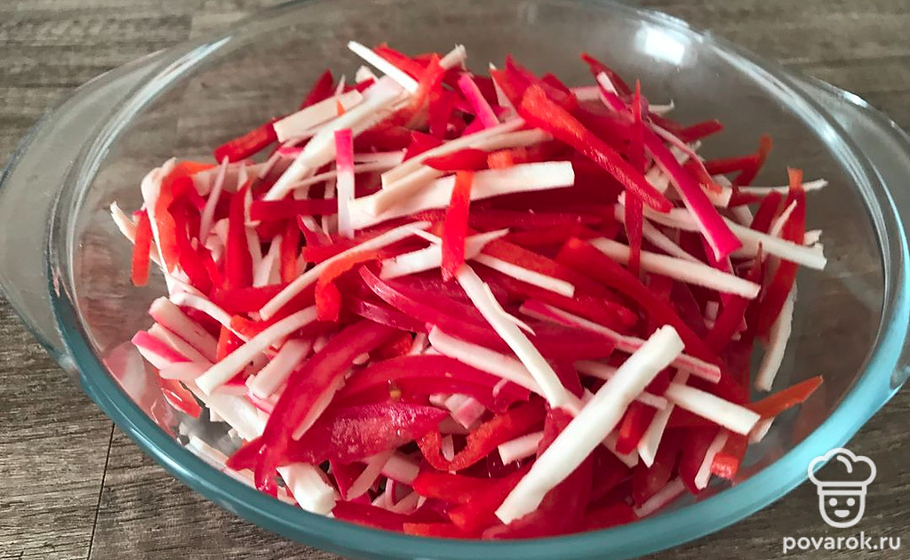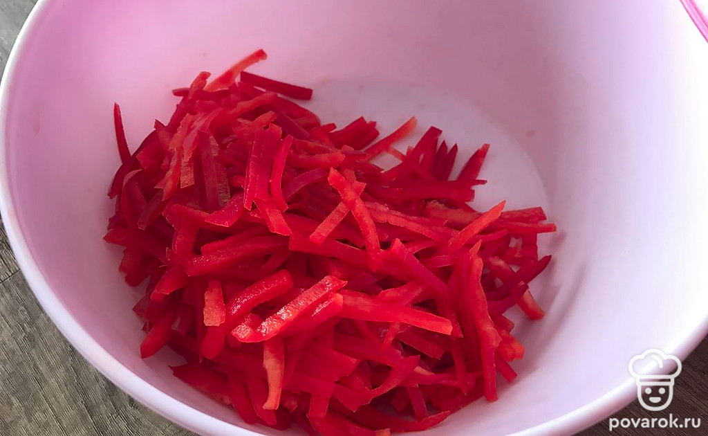 Перец болгарский нарезаем соломкой.
