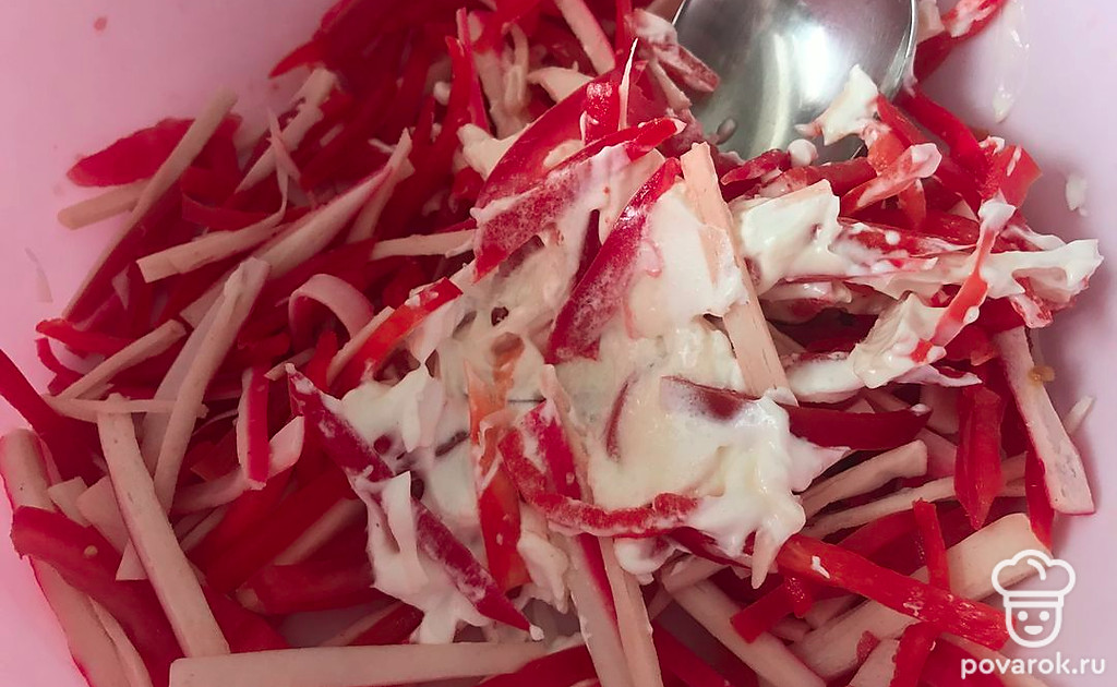 Солим, добавляем майонез и перемешиваем.