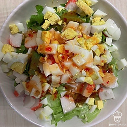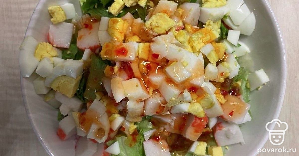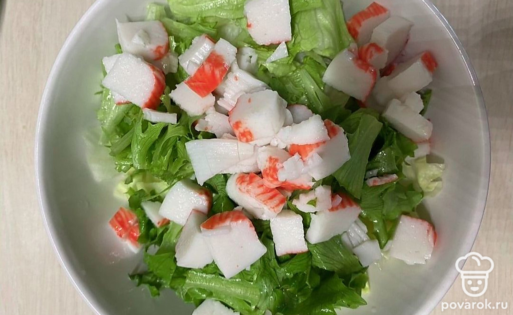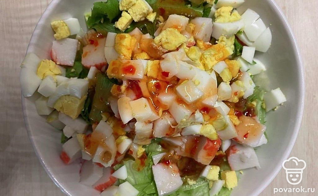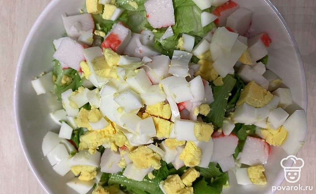 Отварное яйцо нарежьте кубиком и добавьте к салату.