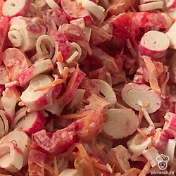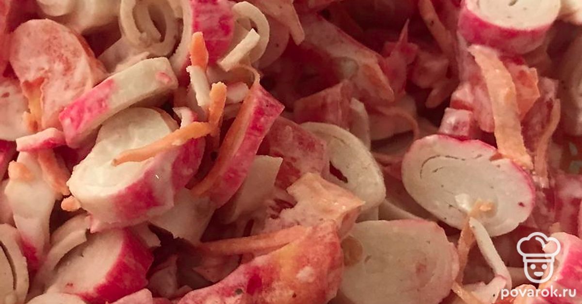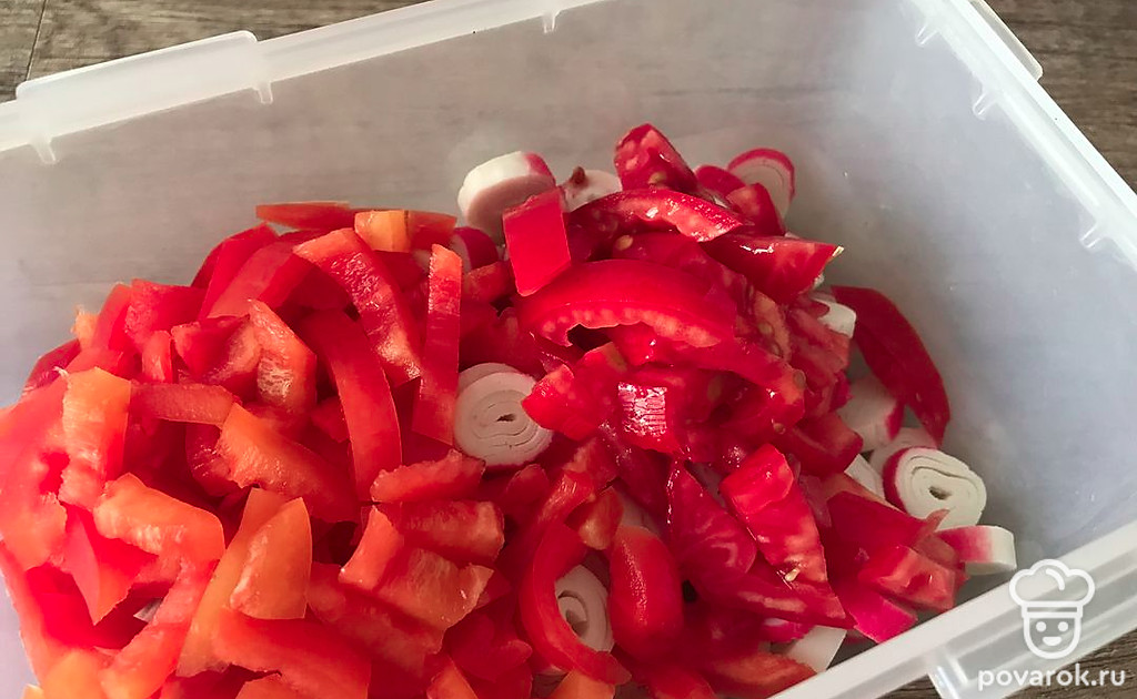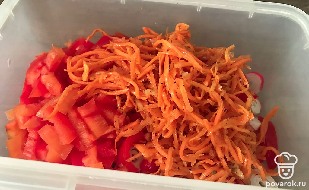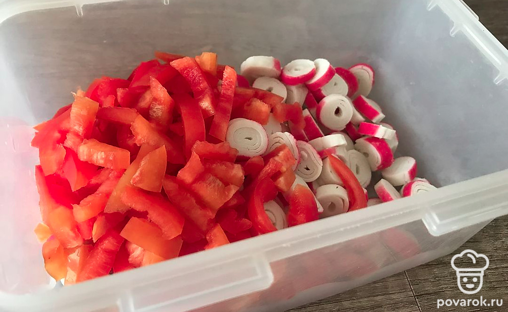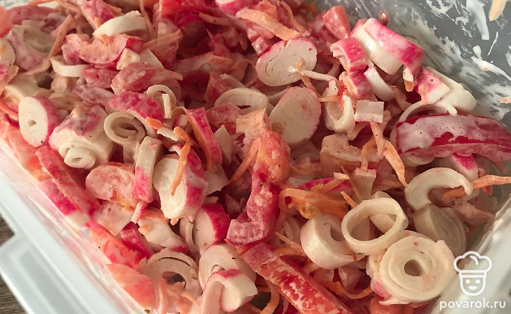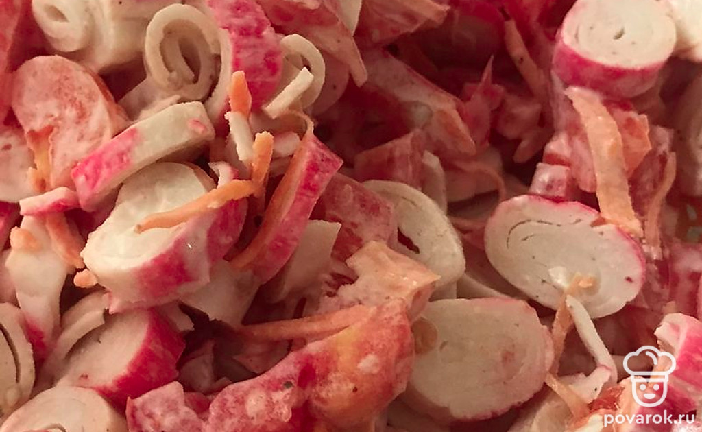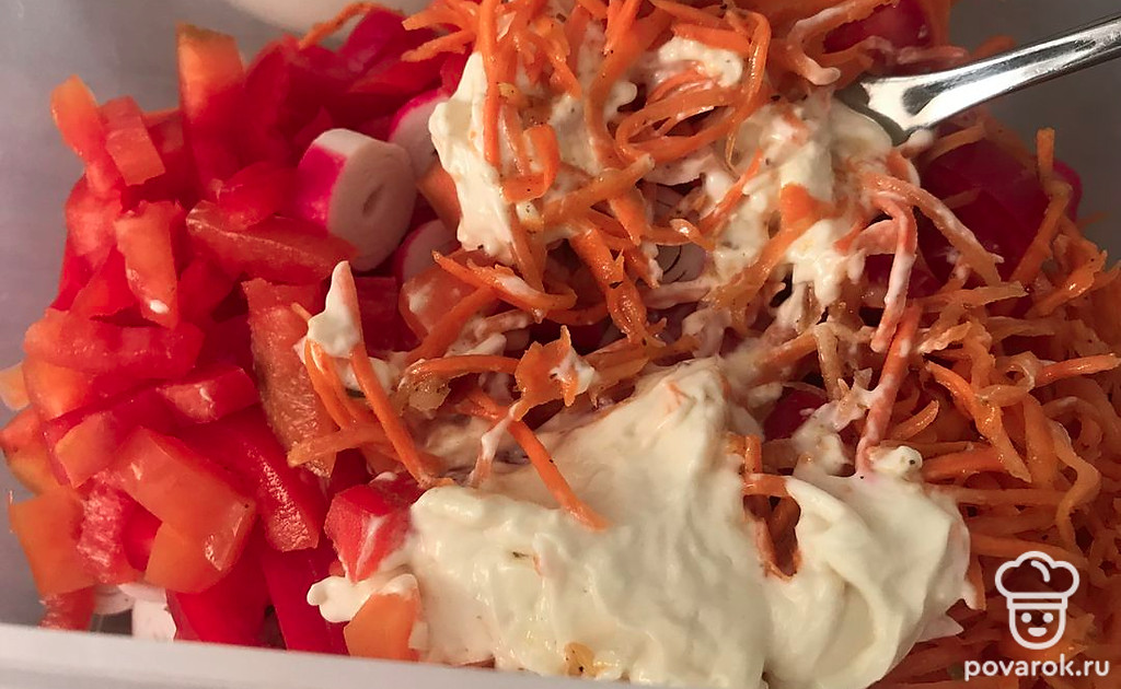 Ароматный салат с крабовыми палочками, морковью по-корейски, перцем и помидорами