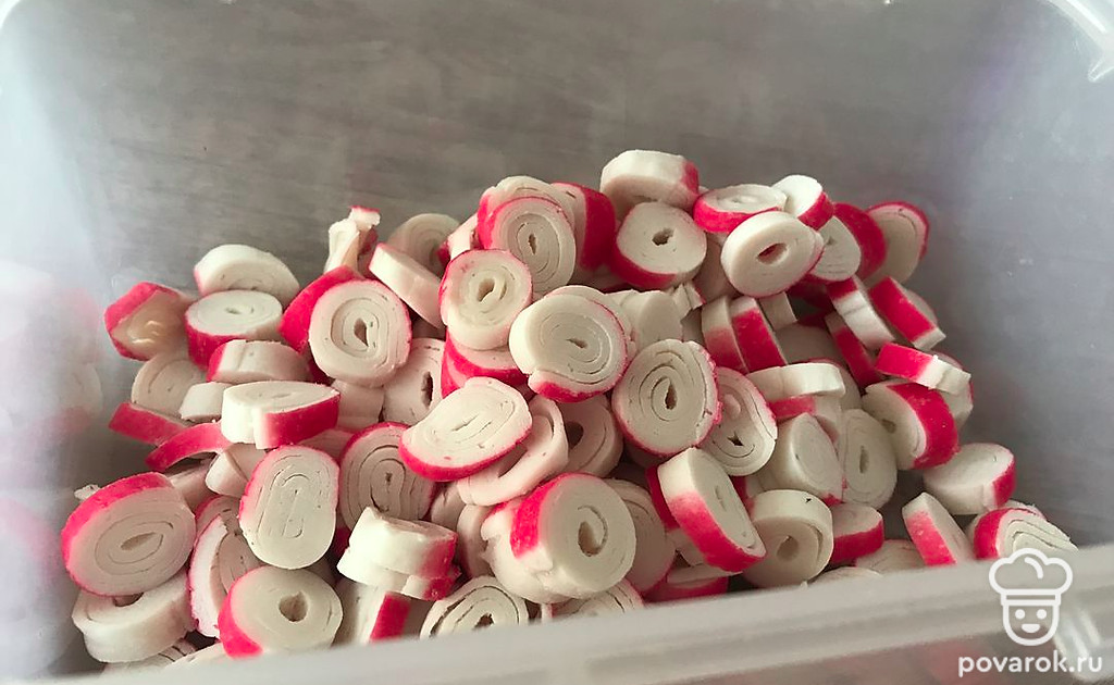 Крабовые палочки нарезаем кружочками и выкладываем в миску.