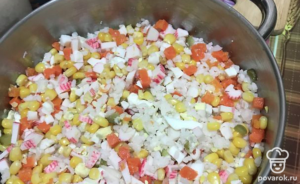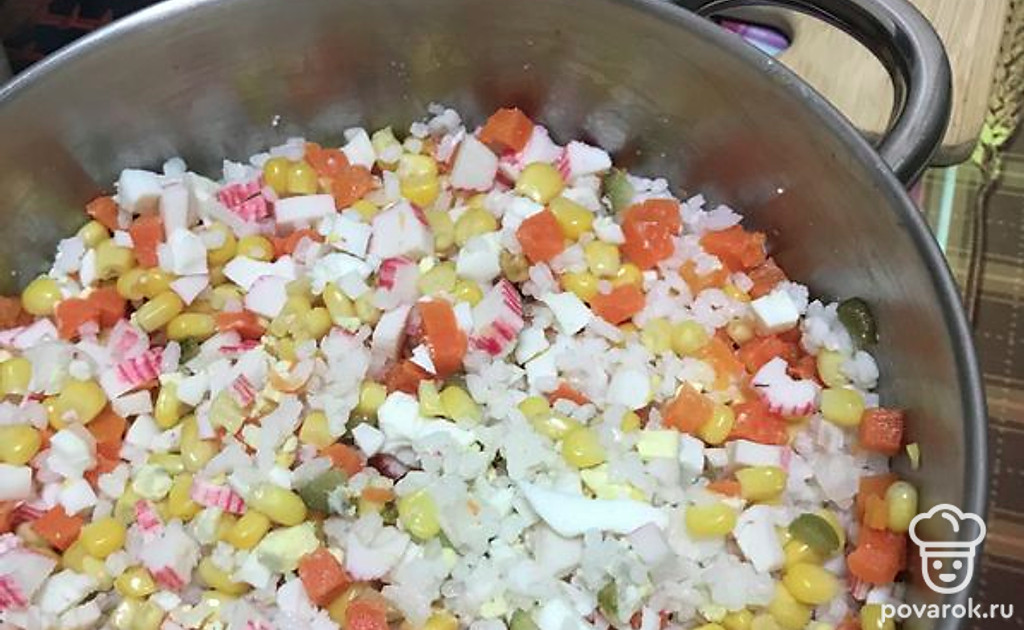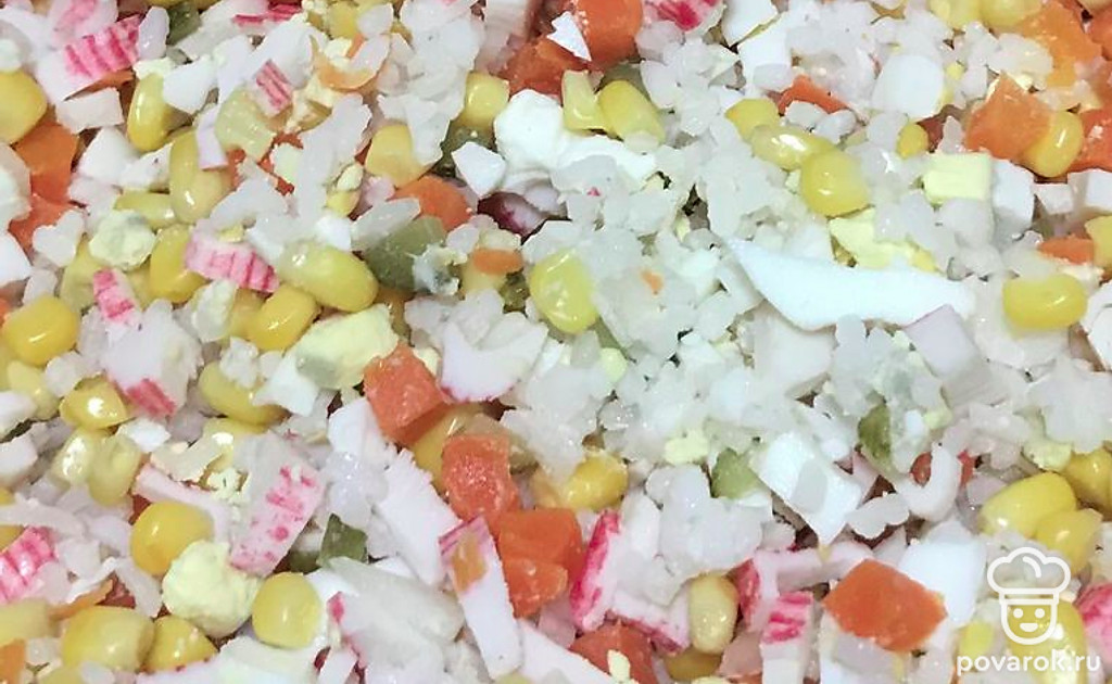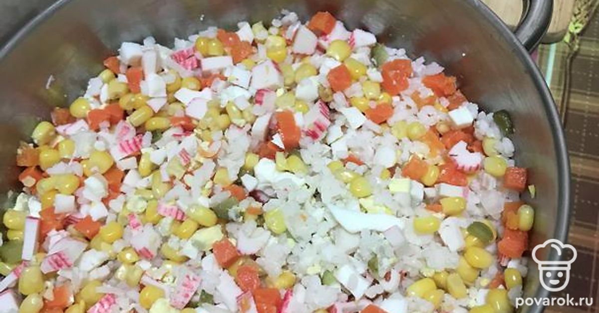 Салат с крабовыми палочками, малосольными огурцами и рисом