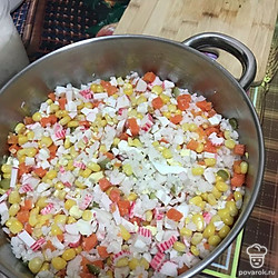 Яркий и питательный салатик с крабовыми палочками, рецепт отличается от обычного наличием риса и моркови.