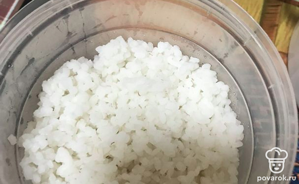 Рис варим до готовности в большом количестве воды, затем промываем холодной водой и отжимаем его от воды.