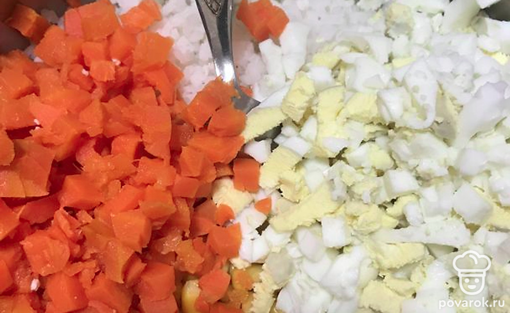 Добавив все ингредиенты, кроме майонеза, перемешиваем и убираем в холодильник! Майонез добавляем по вкусу перед употреблением!