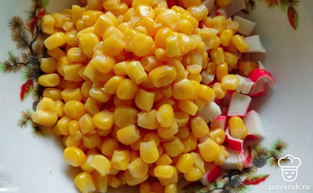 Жидкость с кукурузы слить и отправить зерна к крабовым палочкам.