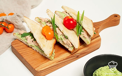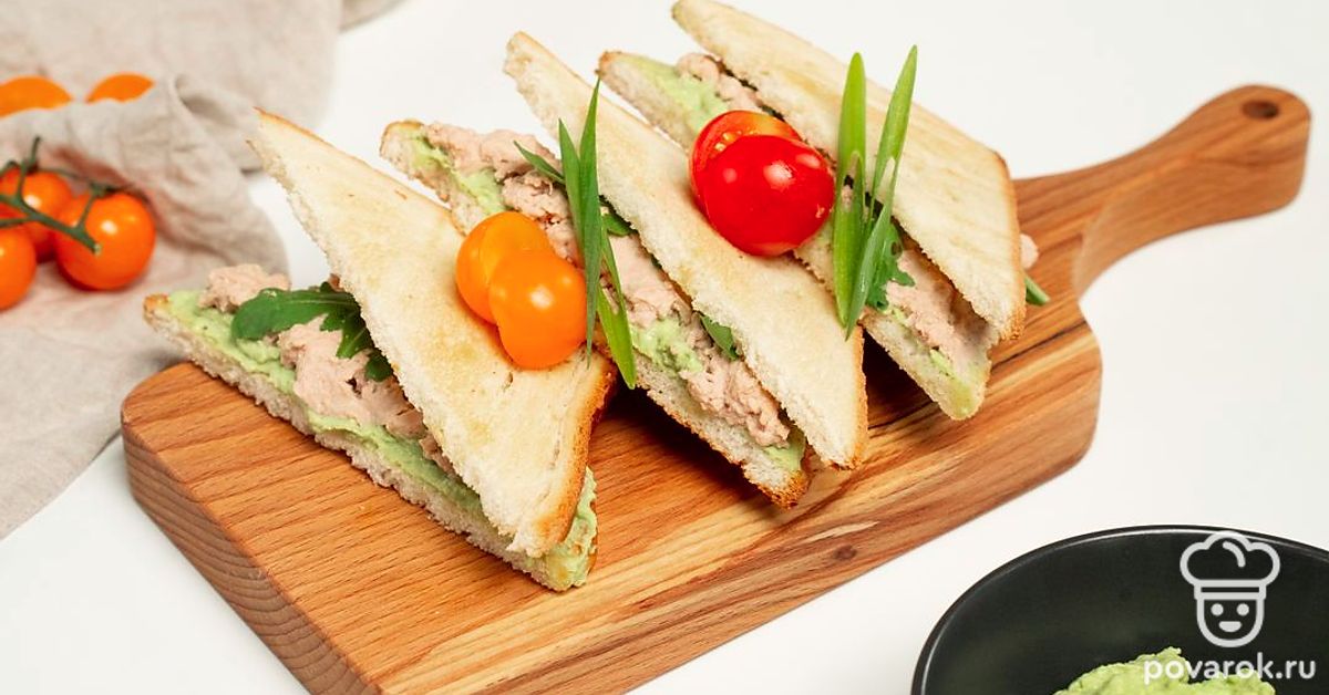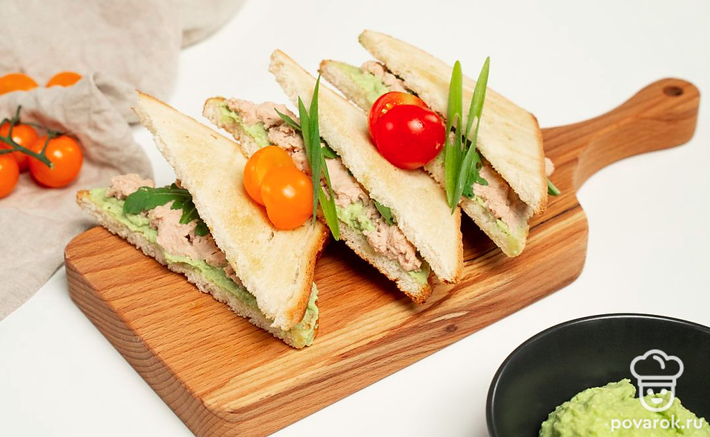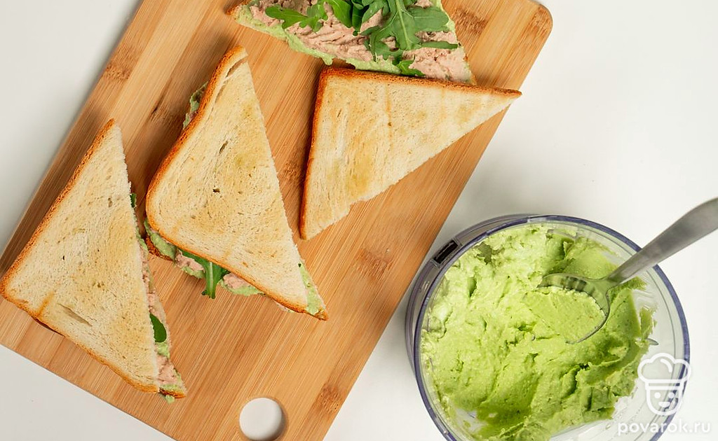 Подсушите хлеб. Разрежьте куски хлеба пополам на треугольники. Сбрызните их растительным маслом и подержите в разогретой до 180 градусов духовке 3-4 минуты. Достаньте из печи и остудите. На половину остывших ломтиков намажьте пюре из авокадо, сверху выложите печень трески и листья руколы. Прикройте оставшимися половинками хлеба.
