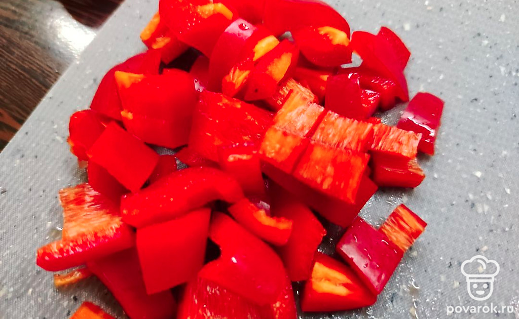 Нарежьте кубиками перец.