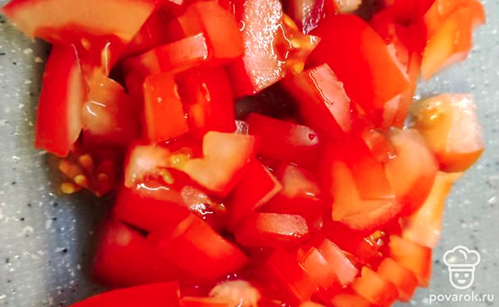 Нарежьте кубиками помидоры.