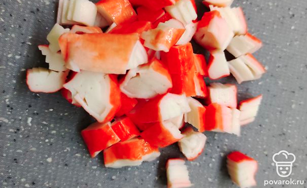 Нарежьте кубиками крабовые палочки.