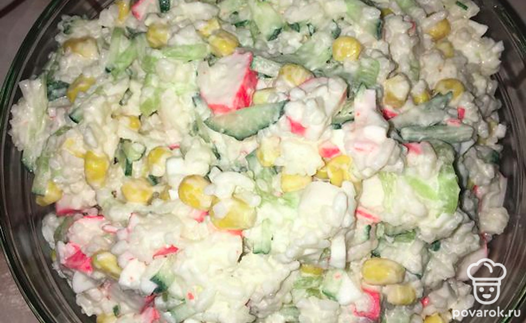 Добавляем рис. Я решила поменять тарелку на более глубокое блюдо, чтобы мне было удобнее потом перемешивать салат.