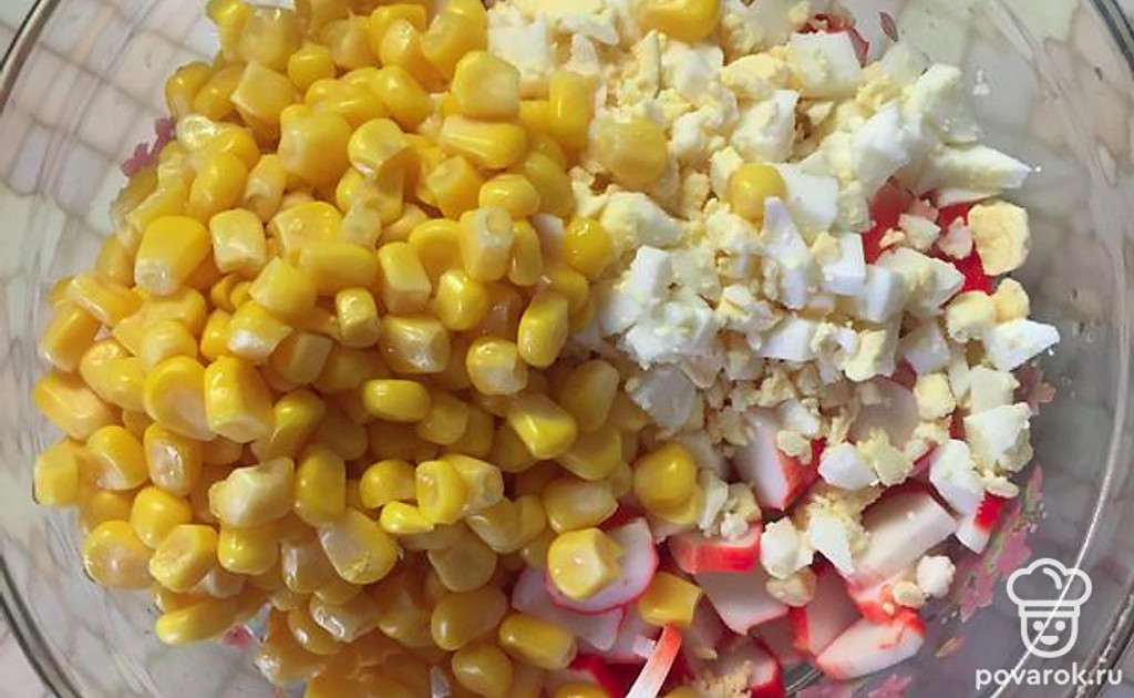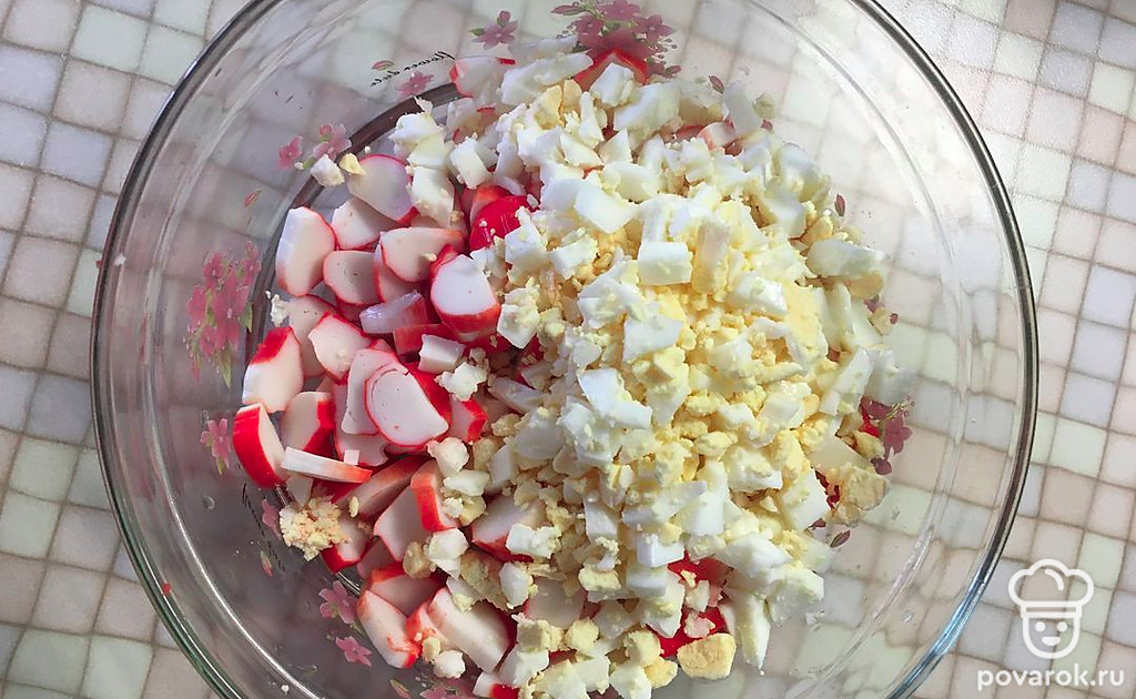 Затем режем яйца и добавляем их к крабовым палочкам.