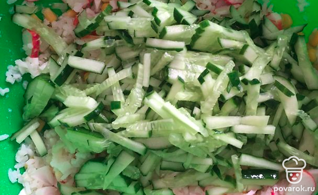 Режем тонкой соломкой огурец.