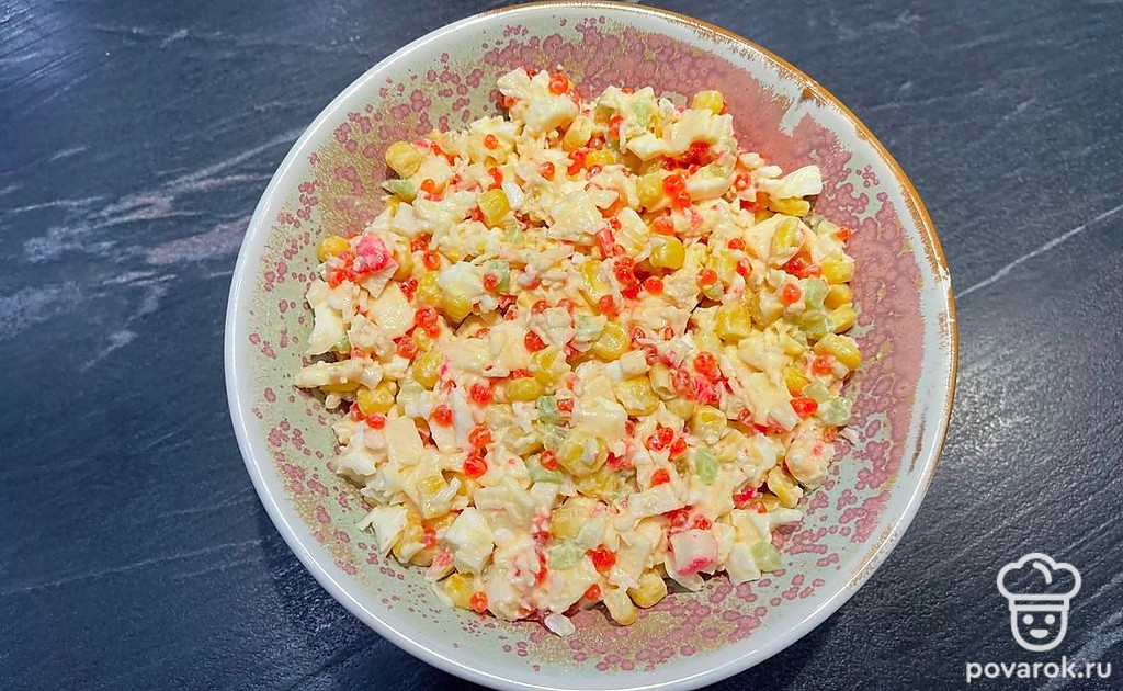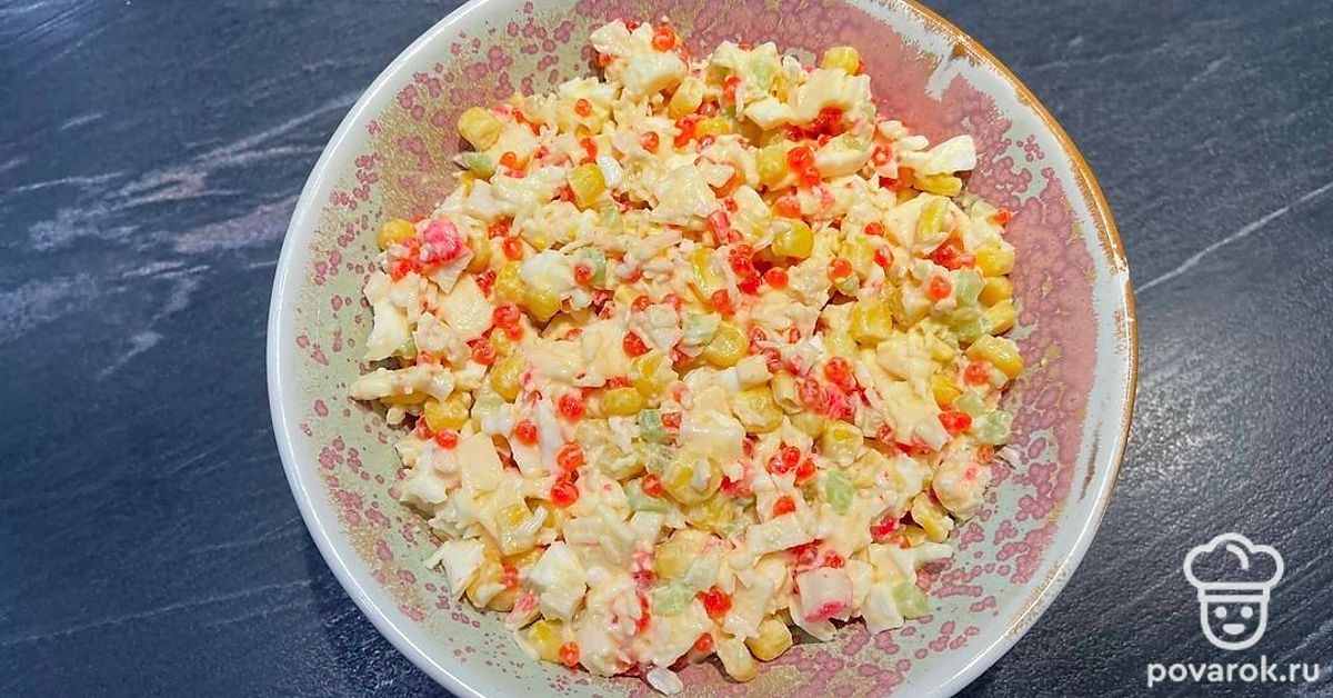 Смешайте все ингредиенты: крабовые палочки, яйца, кукурузу и огурец. Заправьте майонезом и хорошенько перемешайте. Украсить салат можно икрой. Подавайте к столу!