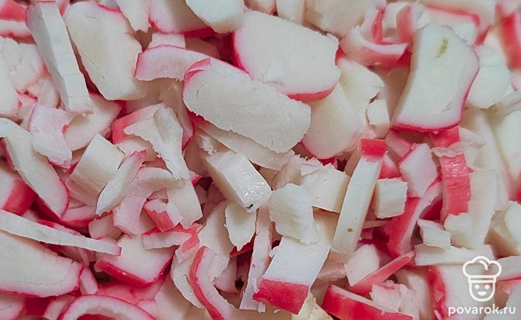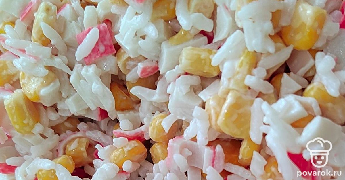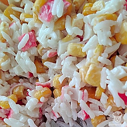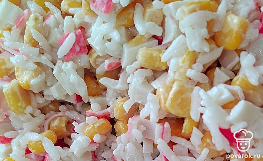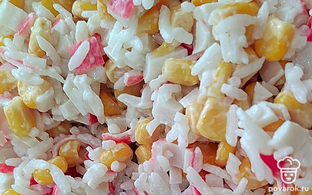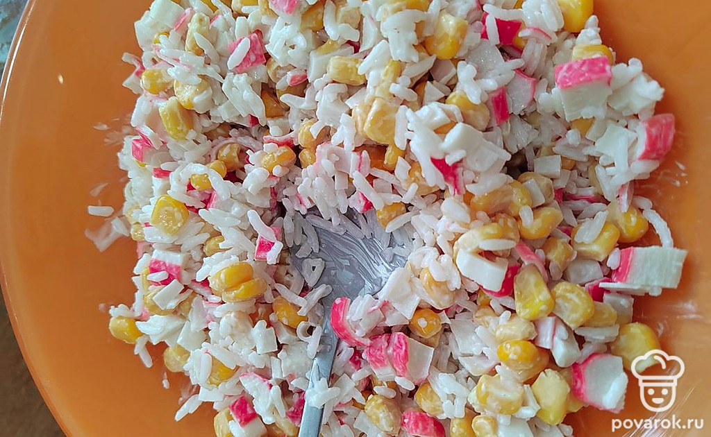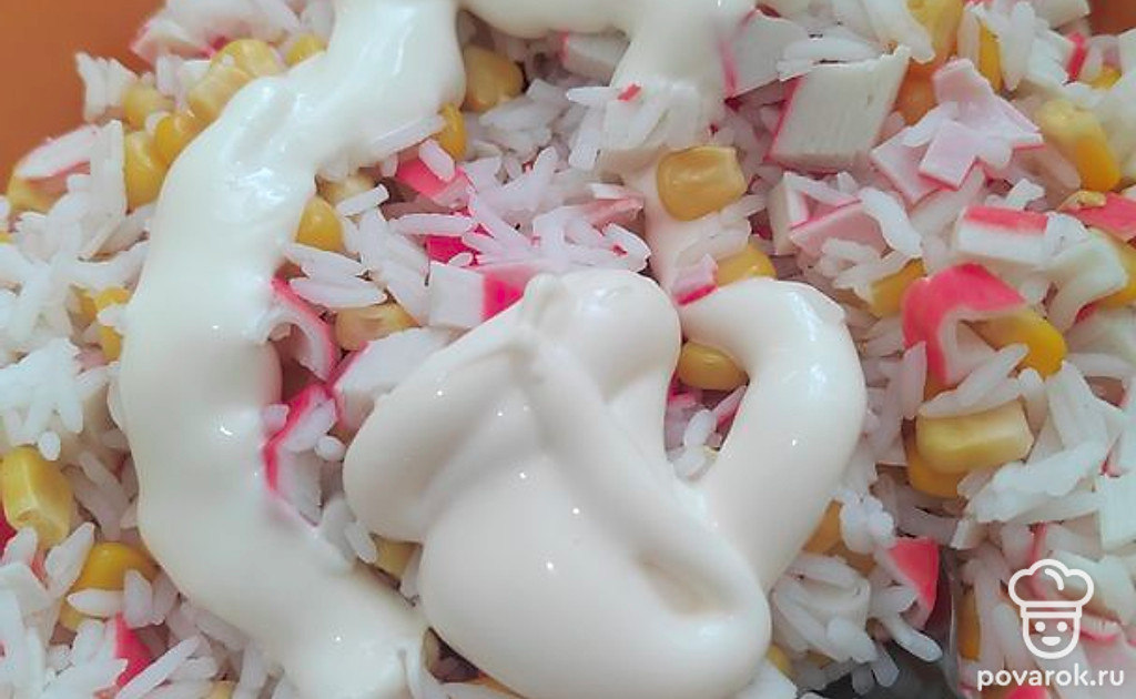 Отвариваем рис до готовности (желательно заранее замочить, тогда варить быстро получится, минут 5), промываем в холодной воде. Всю воду сливаем хорошо, добавляем рис к другим ингредиентам. Добавляем майонез.