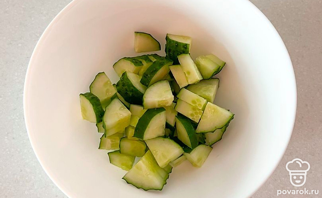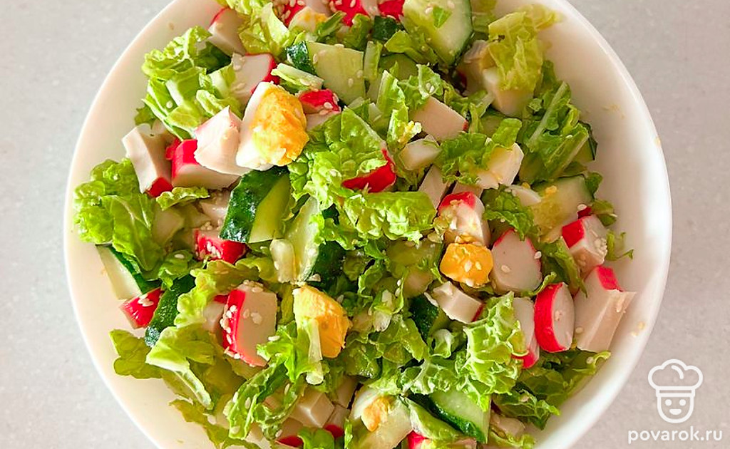 Следом средними кусочками нарежьте яйца, пекинскую капусту, крабовые палочки.