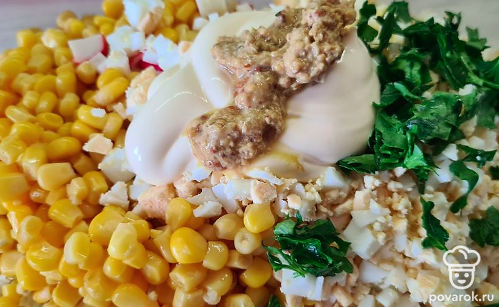 Добавьте в салат нарезанные отварные яйца, зелень, кукурузу. Заправьте майонезом с горчицой. Посолите по вкусу и все перемешайте.