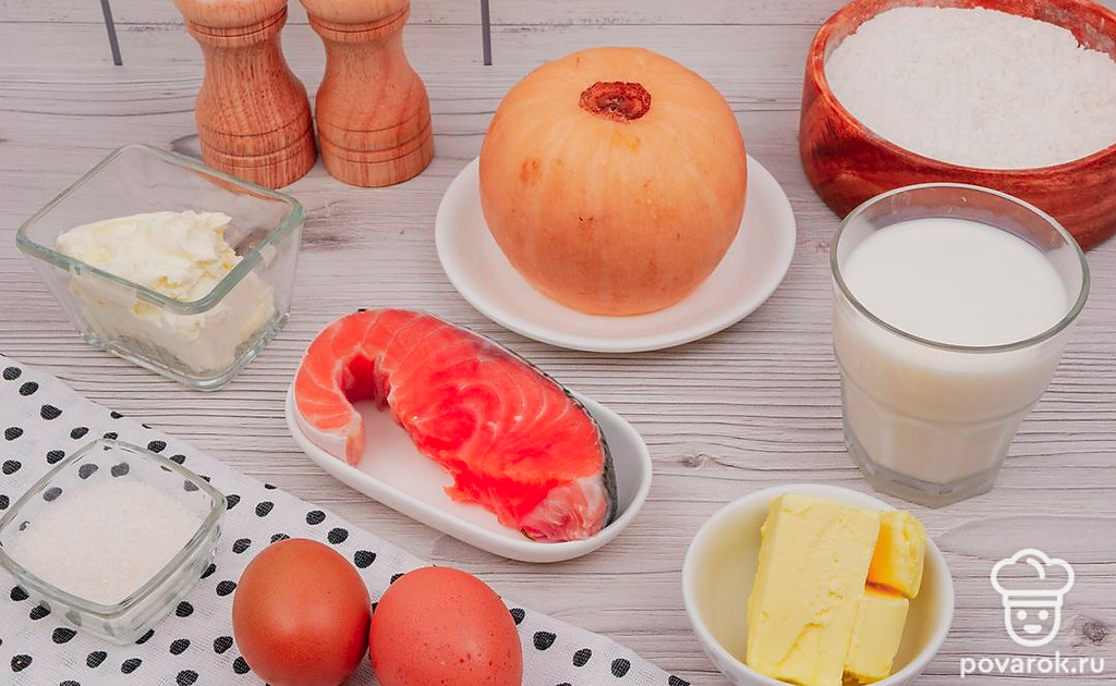 Очистите тыкву от кожуры и семечек. Филе слабосоленого лосося очистите от костей, пленок и кожи. Растопите сливочное масло. Подготовьте остальные ингредиенты. Разогрейте духовку до 200°С.