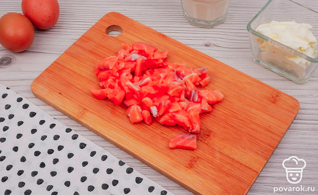 Нарежьте филе лосося на маленькие кубики размером 4-5 мм.