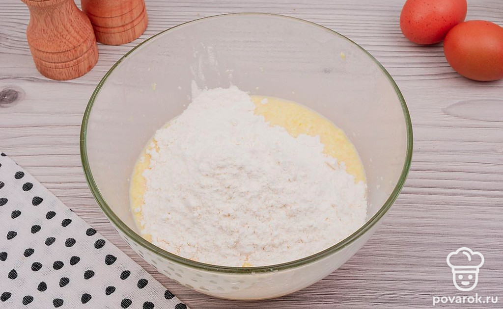 Приготовьте тесто. Для этого в глубокой миске смешайте молоко, растопленное сливочное масло, два яйца, сахар, соль, разрыхлитель и просеянную муку.