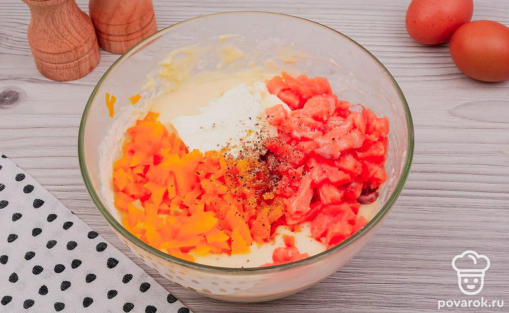 Добавьте в тесто сливочный сыр, лосось и тушеную тыкву. Все тщательно перемешайте.