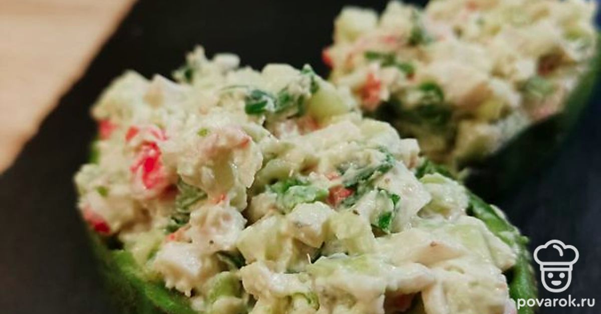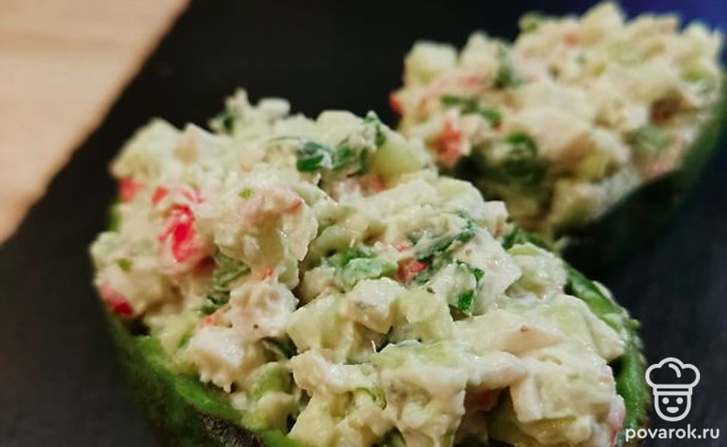 Заправьте салат творожным сыром и выложите в лодочки из авокадо.