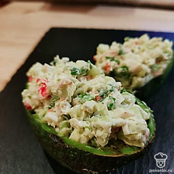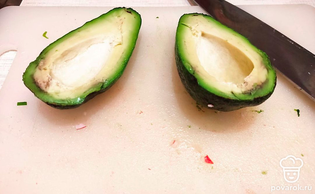 Авокадо стоит покупать спелым. Вынимать мякоть нужно аккуратно, чтобы не повредить кожу, это и будут лодочки для подачи. Не забудьте сбрызнуть авокадо лимонным соком, чтобы оно не потемнело.