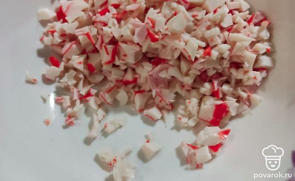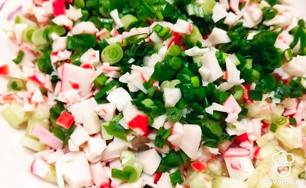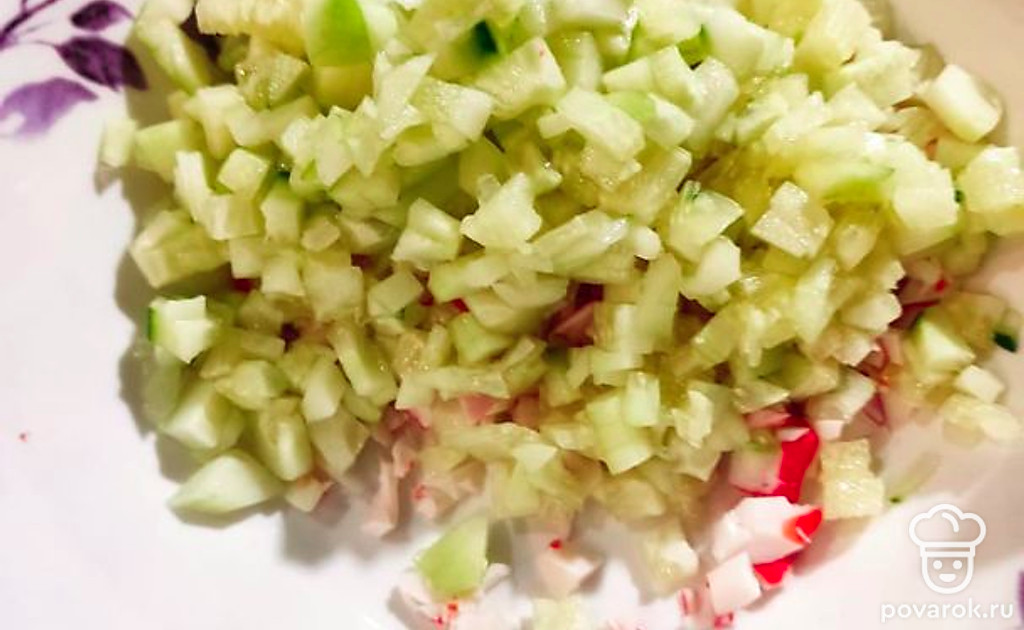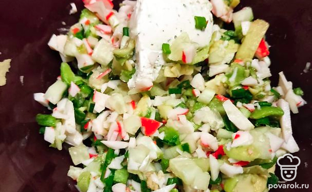 Соедините все вместе: крабовое мясо, авокадо огурец и лук.