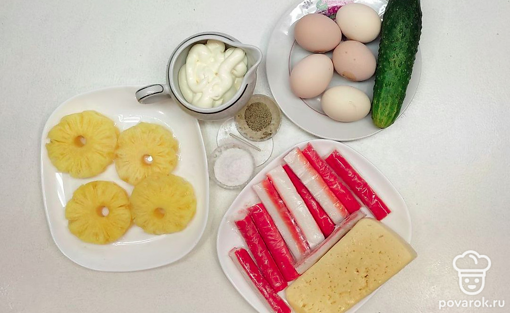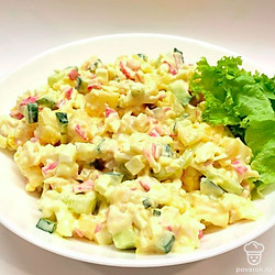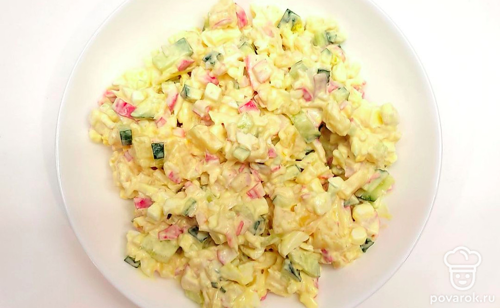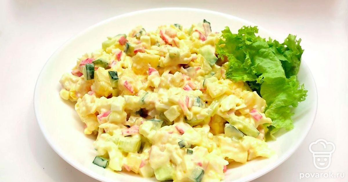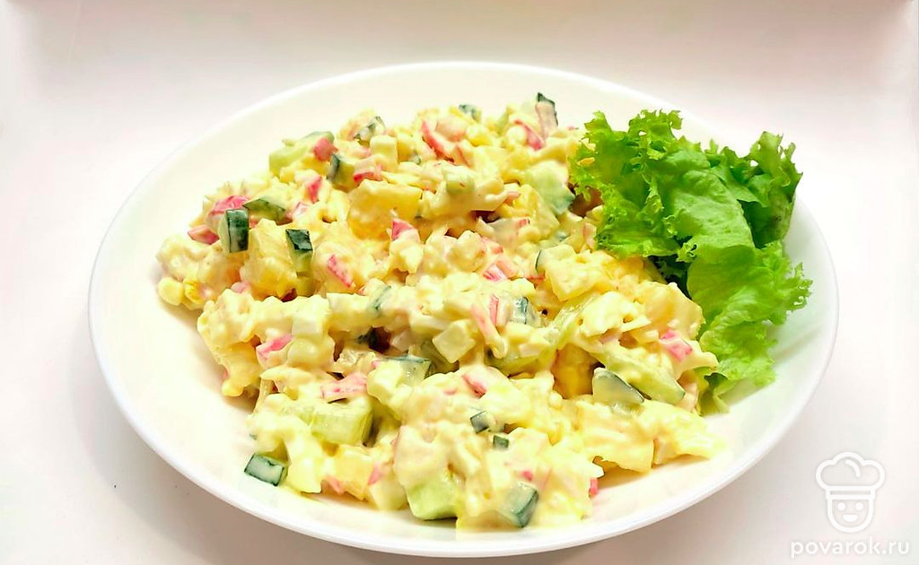 Несомненно, салат с крабовыми палочками стал одним из любимых праздничных салатов, как у взрослых, так и у детей. Вариаций, этого блюда очень много, но Вы обязательно должны попробовать приготовить крабовый салат «Бунгало». Крабовые палочки обогащают блюдо легкой морской ноткой, невероятную свежесть и аромат, салату придают свежие огурчики, отварные яйца и сыр делают его более насыщенным и сытным, а вот пикантность придает сладкий, сочный ананас.