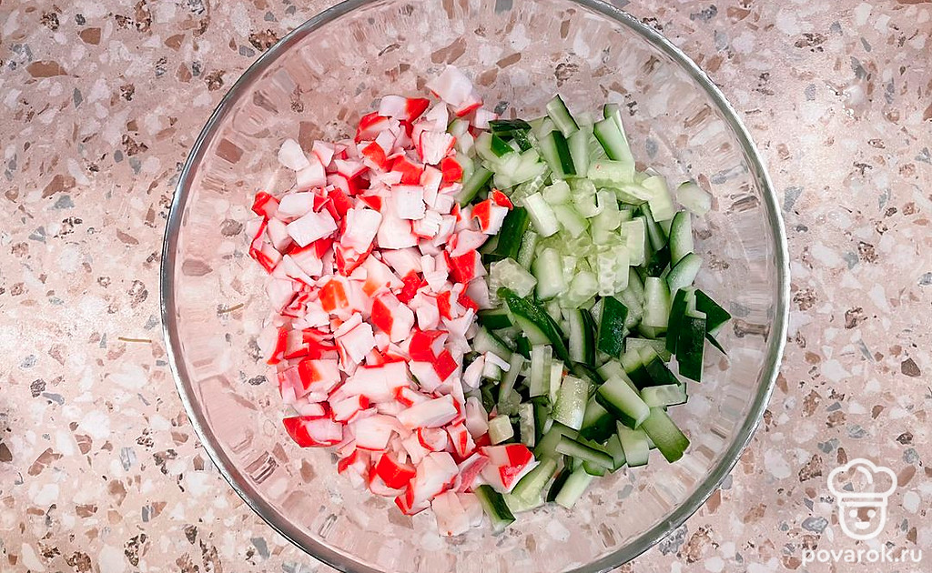 Нарезать крабовые палочки и огурцы. Положить в салатник.