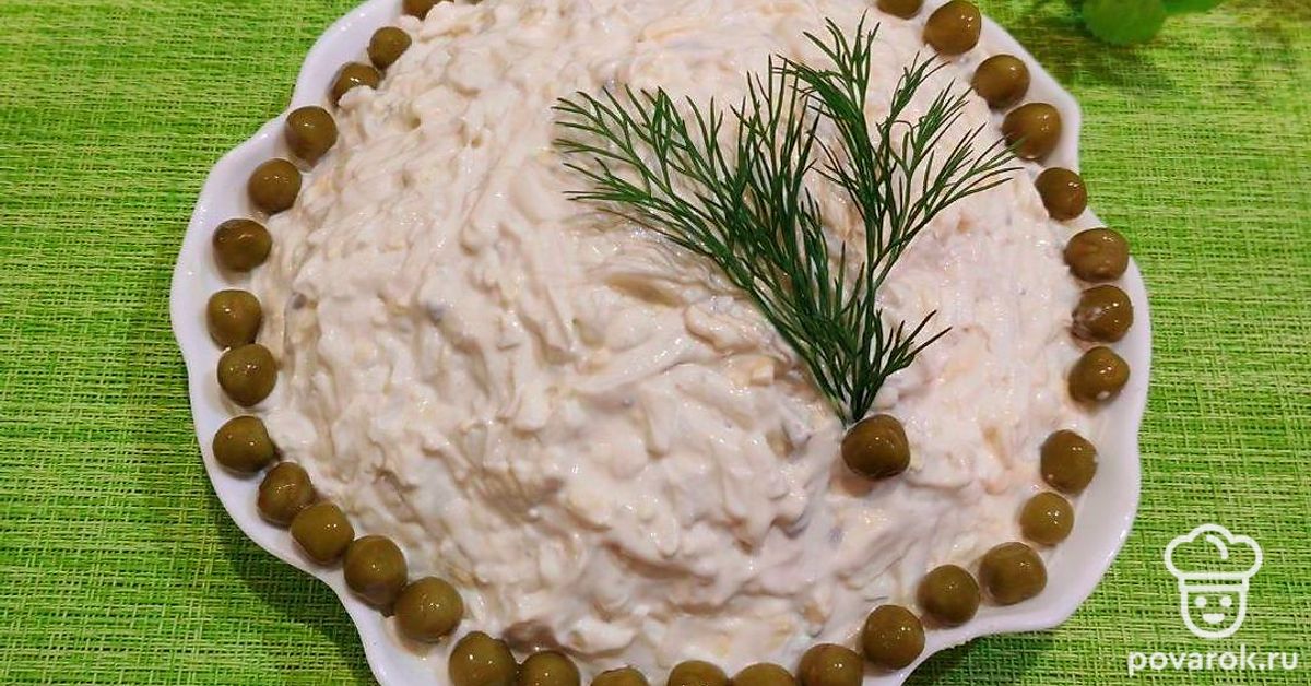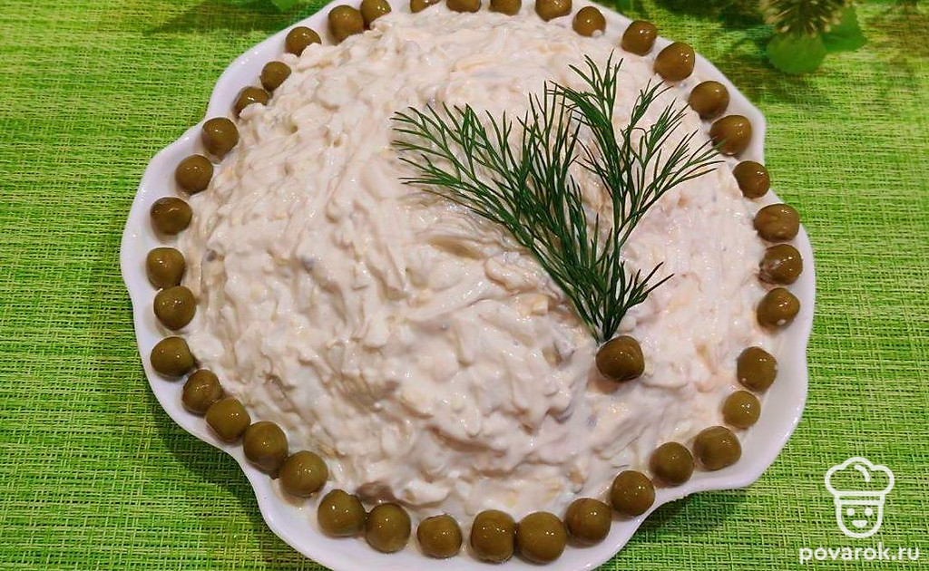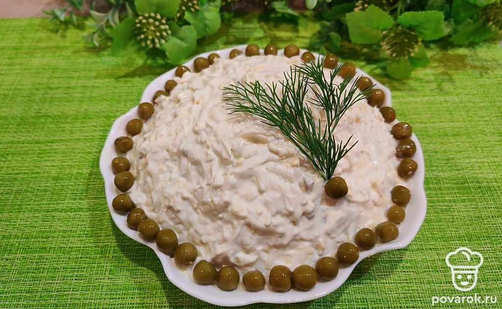 Подавайте салат охлажденным, украсив зеленью и консервированным горошком.