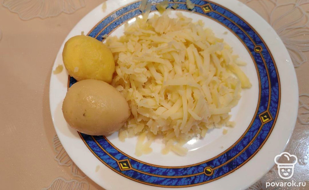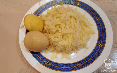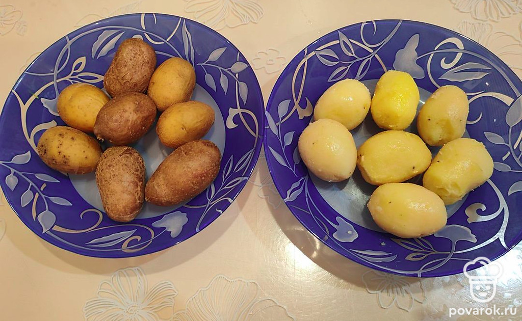 Возьмите 300 граммов картошки, помойте. Картофель отварите в мундире (25 минут), остудите и почистите.