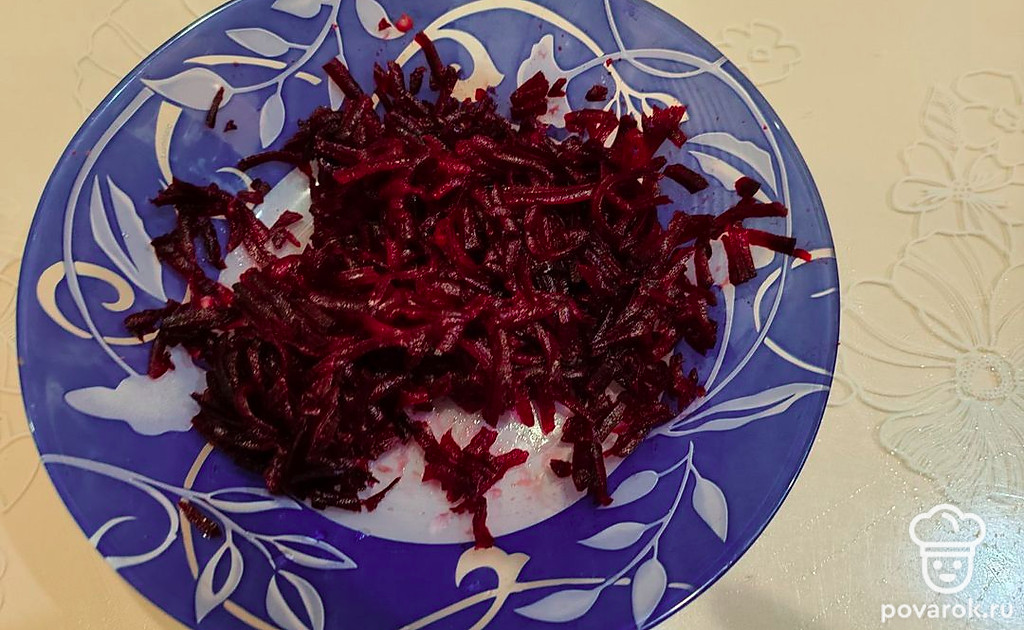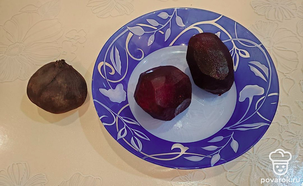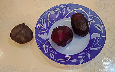 Возьмите 2 свеклы. Варите в течение 1 часа. Остудите и почистите.