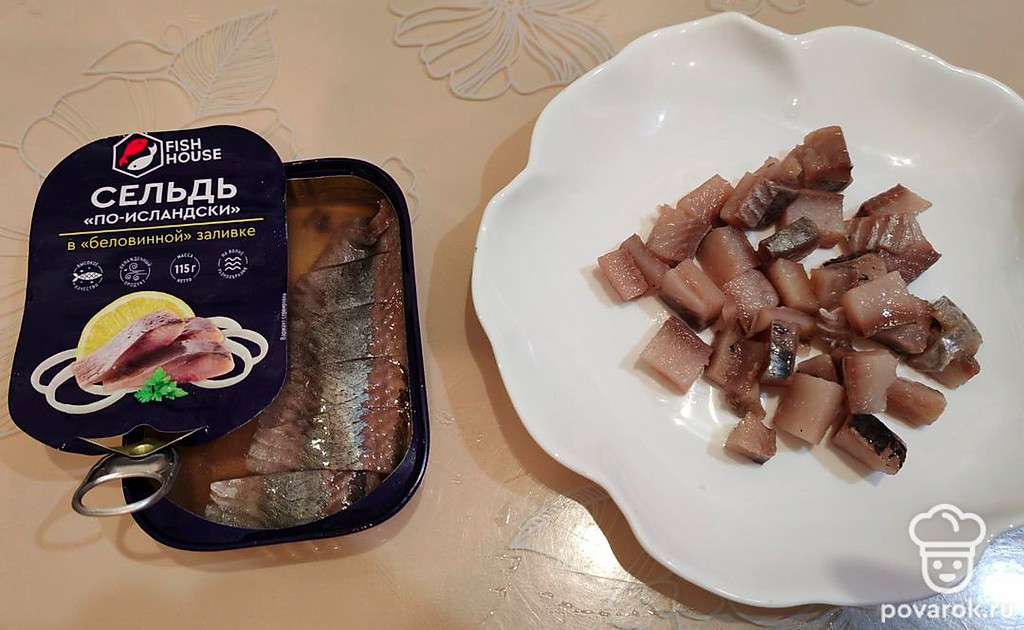 Возьмите сельдь по-исландски, нарежьте на кусочки 1,5 на 1,5 сантиметра. Выложите сельдь на тарелку.