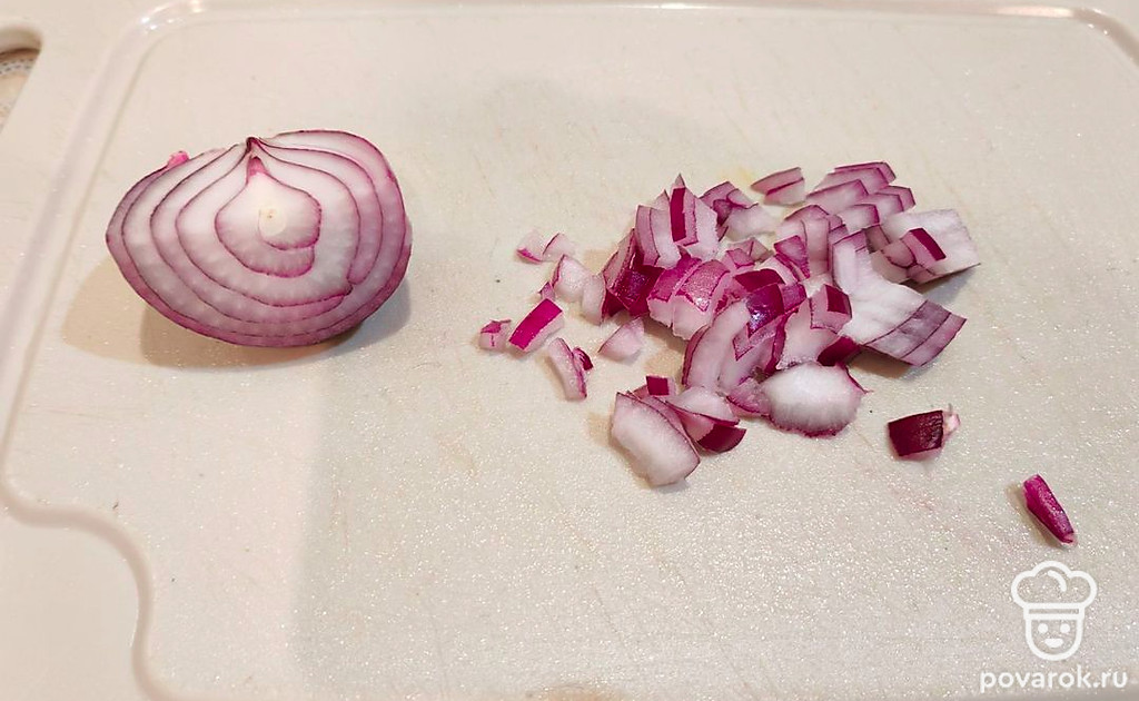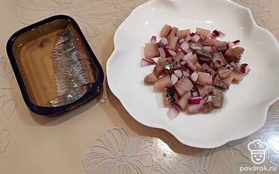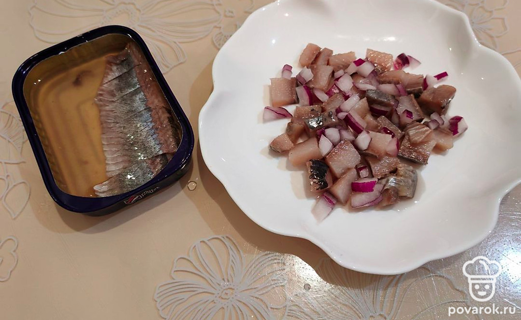 Половинку луковицы нарежьте мелким кубиком и выложите на селедку.