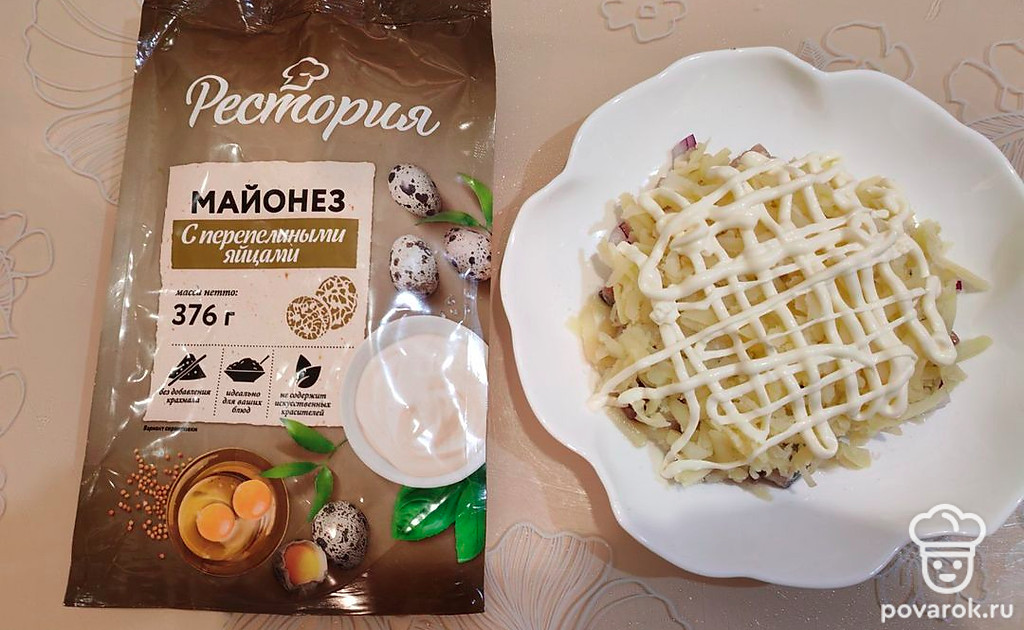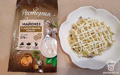 Выложите на селедку слой картошки, посолите и нанесите майонез тонкой струйкой (1 чайная ложка). Получится сетка.