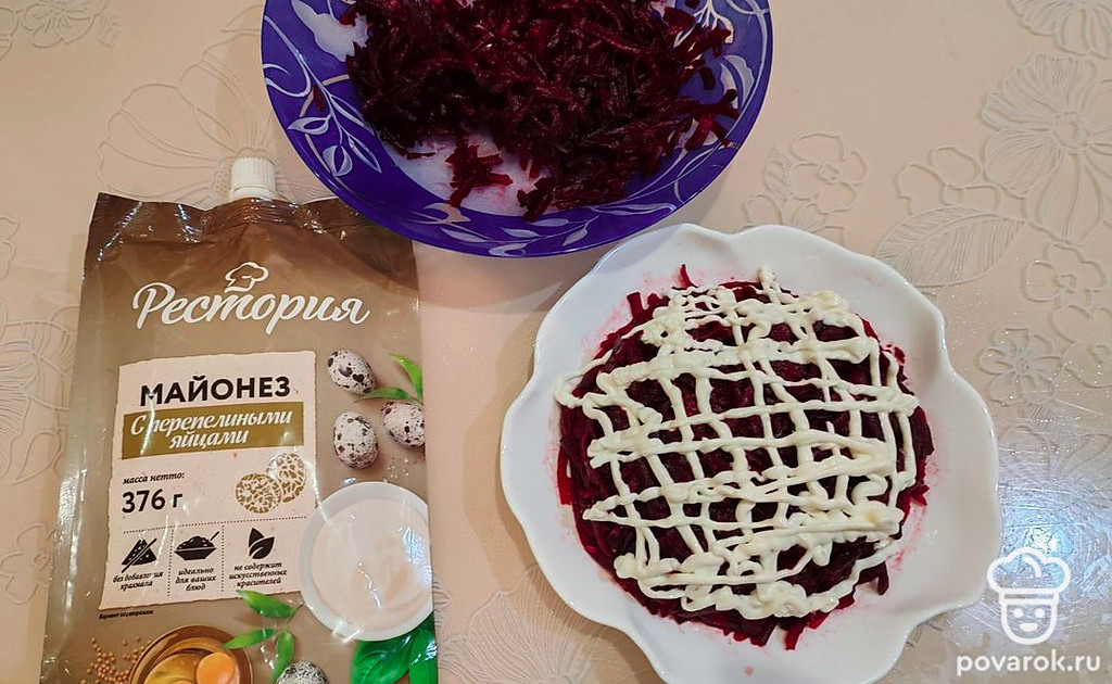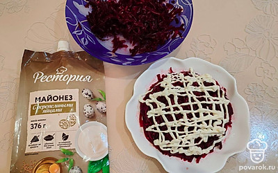 Выложите слой свеклы, нанесите тонкой струйкой 1 столовую ложку майонеза.