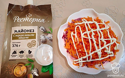 Морковь натрите на крупной терке. Выложите слой моркови, нанесите майонез (1 чайная ложка).