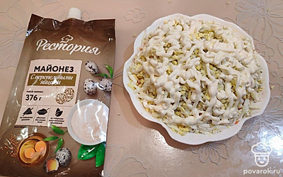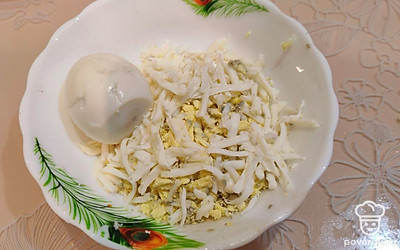 Выложите слой из яиц, посолите, смажьте 1,5 столовыми ложками майонеза.